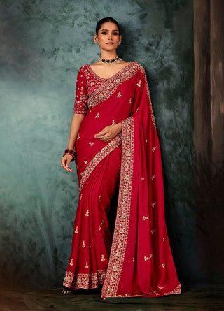 Monjolika Fashion Red Wear Fabric Embroidery Bridal Reception Festival Wedding Wear Heavy Border Saree