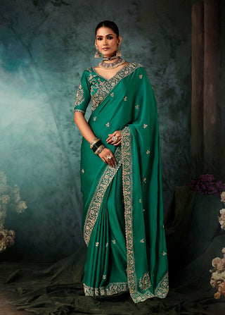 Monjolika Fashion Teal Green Faux Satin Embroidery Bridal Reception Festival Wedding Wear Heavy Border Saree