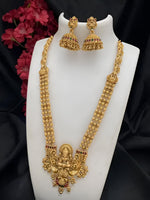 This exquisite gold-plated jewelry set showcases the timeless elegance of traditional Indian craftsmanship. The centerpiece of the necklace is a stunning pendant featuring a detailed depiction of the Hindu goddess Lakshmi, the embodiment of wealth, prosperity, and good fortune. The pendant is surrounded by an intricate floral motif and adorned with vibrant ruby and emerald accents, creating a truly mesmerizing visual display.The necklace is further enhanced by multiple strands of delicately woven golden chains, adding depth and dimension to the overall design. Complementing the necklace is a pair of matching jhumka earrings, featuring a similar ornate pattern and dangling pearl embellishments.Handcrafted with meticulous attention to detail, this Lakshmi pendant necklace set is a testament to the rich cultural heritage of the region. The harmonious blend of traditional iconography and contemporary elegance makes it a versatile and timeless accessory, suitable for both formal occasions and everyday wear.Whether you're seeking a statement piece to elevate your traditional attire or a unique and meaningful gift for a special celebration, this magnificent gold-plated Lakshmi necklace set is sure to captivate and impress. Its high-quality construction and enduring beauty ensure it will be a cherished addition to any jewelry collection.