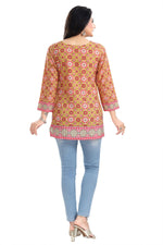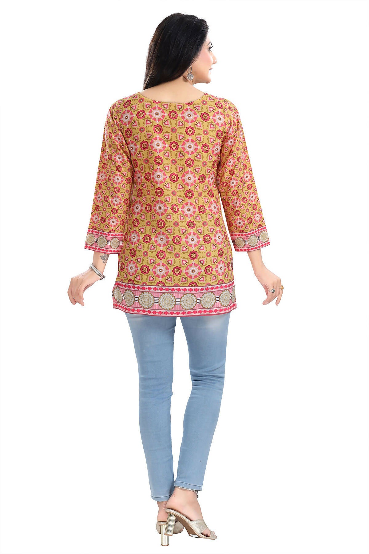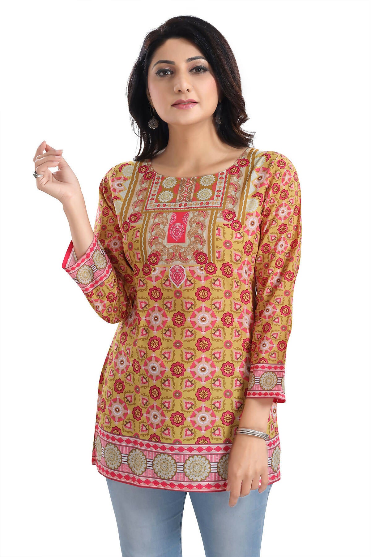 Snehal Creations Yellow Faux Crepe Short Kurti Tunic Top Color: Multicoloured Material: Faux Crepe Legal Disclaimer: Product color may slightly v...