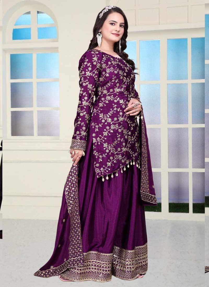 Prazu Fashion Violet Chinon Silk Embroidered Sharara SuitTop:-Fabric : ChinonInner : MicroWork : Sequence Embroidery Work With Real Kodi Lace Bord...