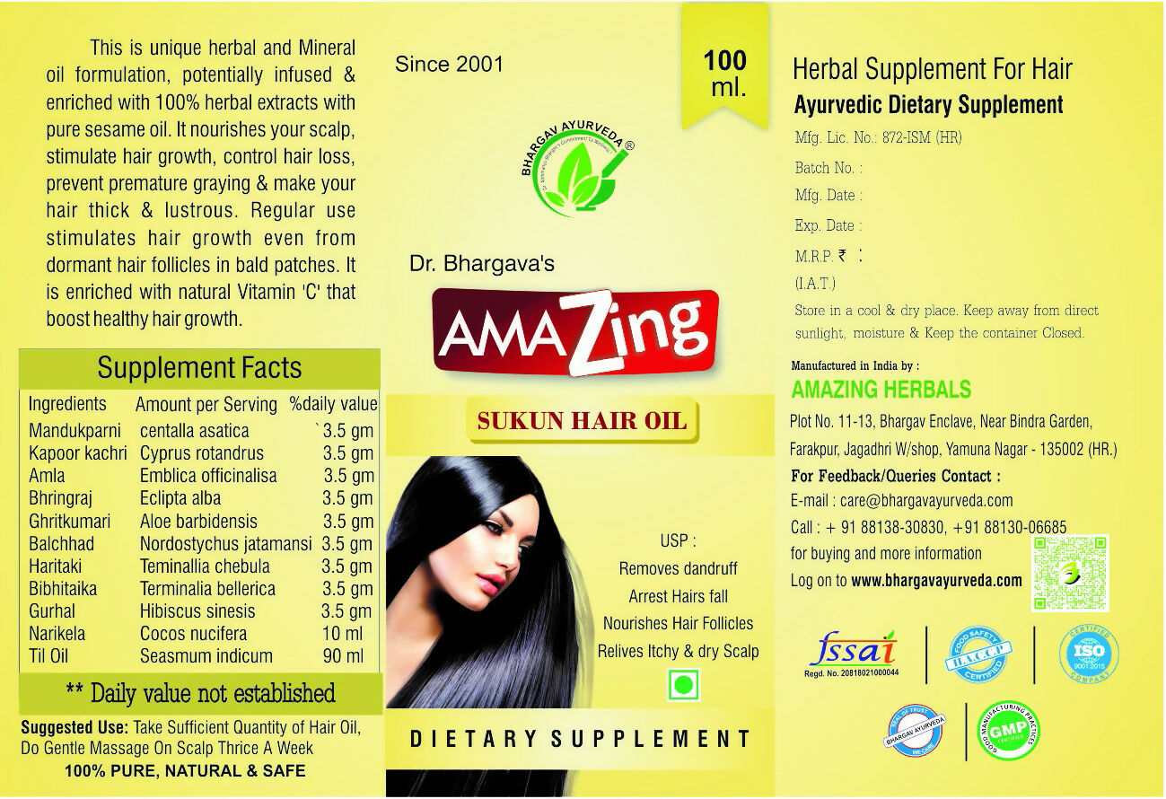 Dr.Bhargav’s Ama Zing Sukun Hair OilAbout the Product:Dr.Bhargav’S Sukun Hair Oil Is Unique Herbal 100 % Pure Til Tail Formulation, Potentially Inf...