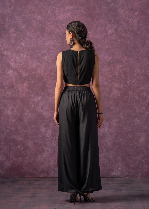 A contemporary black Crop top power dressing. The sleeveless crop top is intricately embellished with tonal bead and sequin work . Perfect for cocktail nights, festive soirées, or modern wedding events, this top reflects understated glamour through a monochrome palette and minimalistic design language.
