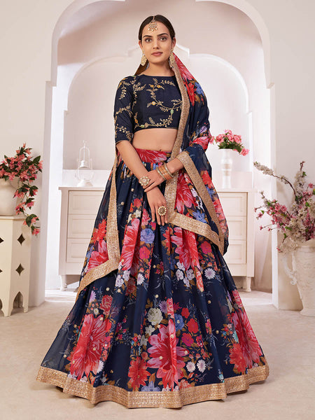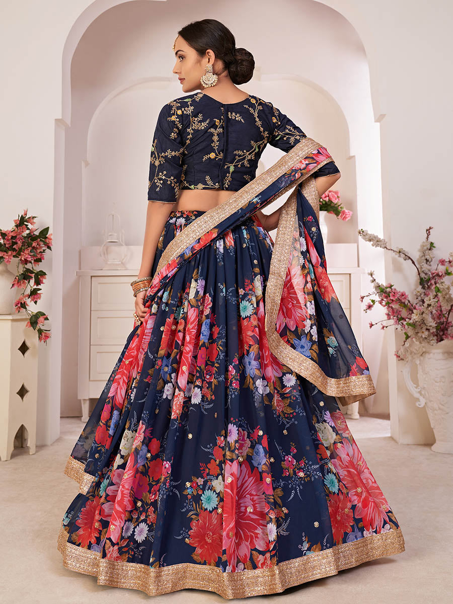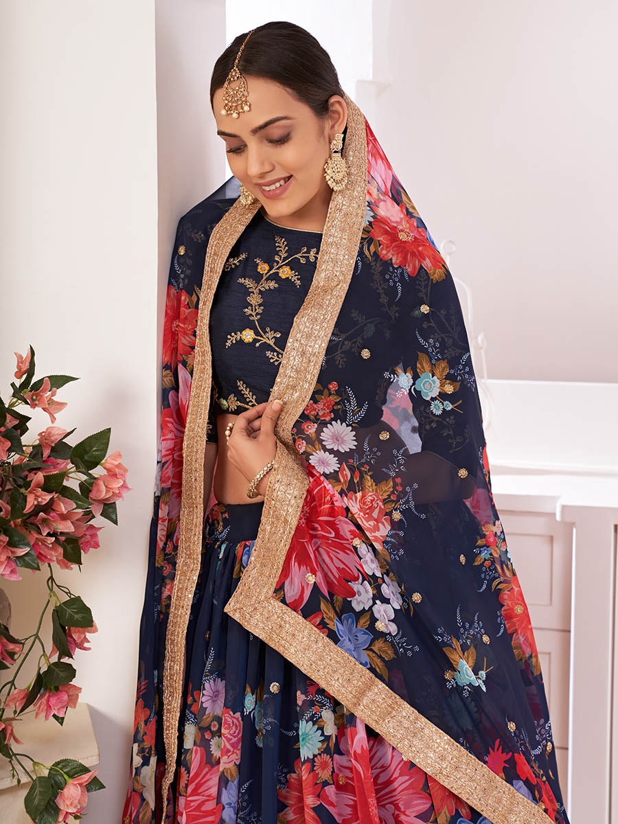 Navy-Blue Digital Printed Gorgette Lehanga Floral Printed And Embellished Sequins Butti Work All Over. The Lehenga Border Ensembled Sequins,Dori Embroidered Work. Comes With Sequins Butti And Dori Embroidered Dupatta. This Style is made in India and checked by hand to ensure high quality.