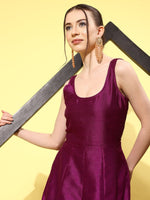 Purple ethnic motifs printed woven maxi dress, has a round neck, no sleeves, lace inserts detail,maxi length in flared hem