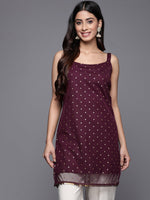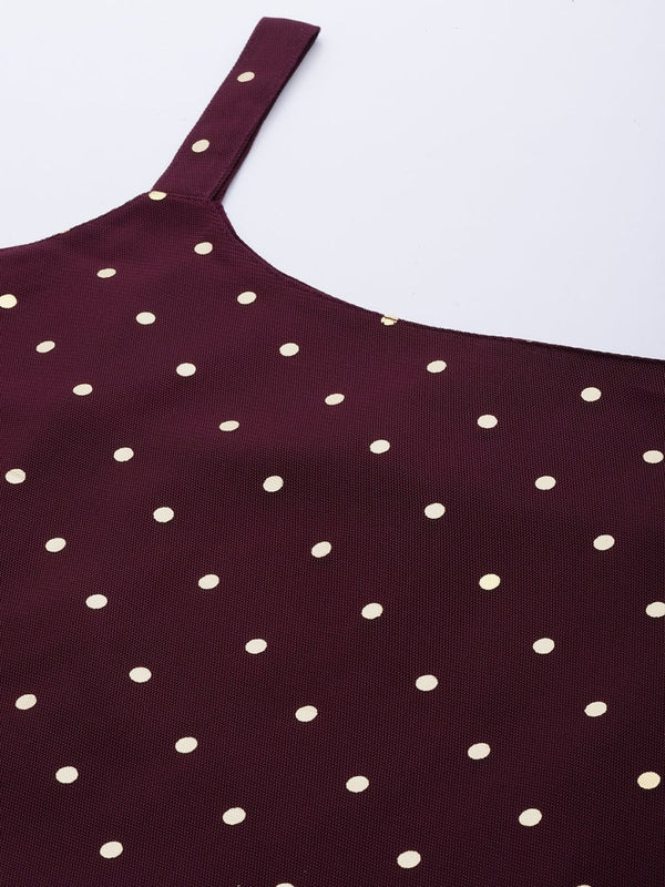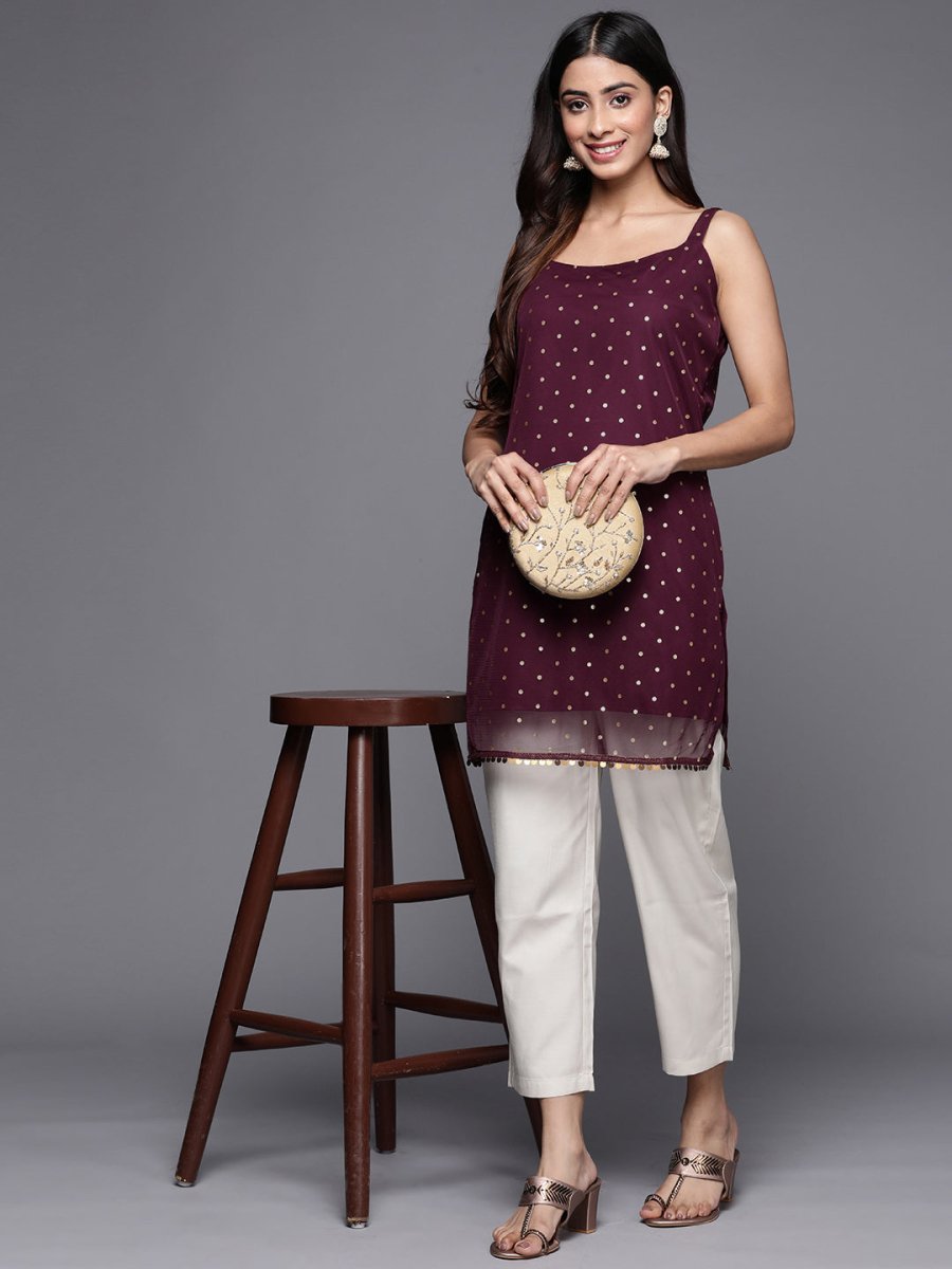 The Burgundy and white geometric printed tunic,has shoulder straps, is sleeveless, lace inserts detail