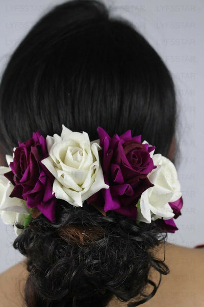 The Purple and White Velvet Rose Gajra is a floral hair accessory crafted for traditional and festive hairstyles. Its soft velvet material makes it lightweight and easy to style.
