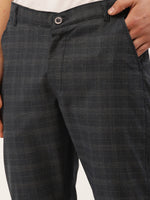 Black Cotton Window Checked Slim Fit Trousers, has a button closure, four pockets