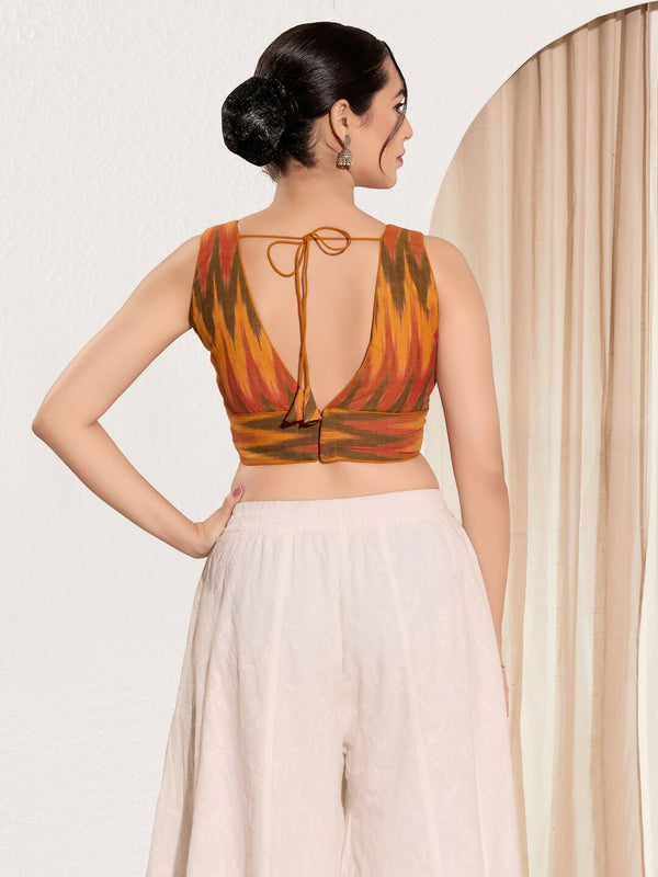 Joban Fashion Mustard Ikat Silk Padded Blouse With V Neck Sleeveless