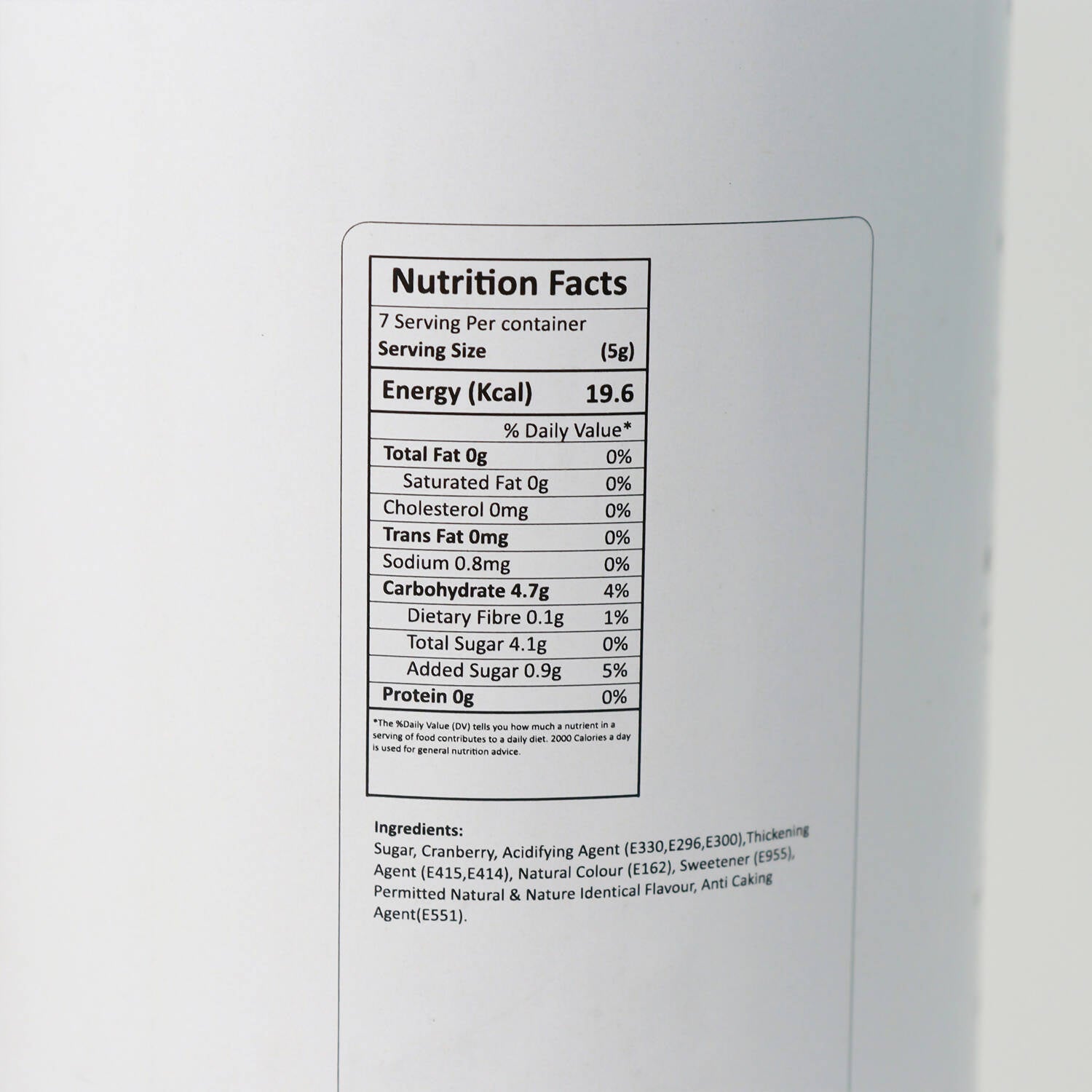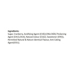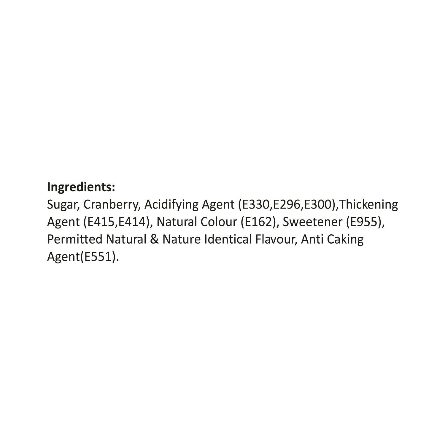 • Sugar, Cranberry, Acidifying Agent, Natural Colour, Sweetener, Permitted Natural & Nature Identical Flavour, Anti Caking Agent.