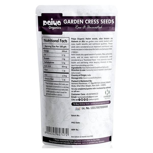 Paiya Organics Garden Cress Seeds Raw & Unroasted Ingredients: Raw Halim seeds Legal Disclaimer: Product images are for illustrative purposes ...