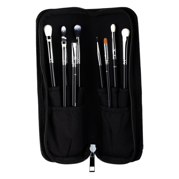 Call yourself a pro with Miss Claire Eye Essential Series designed for a makeup novice to a professional makeup artist. This covetable collection of brush set includes 9 must-have eye brushes for lining, shading, buffing, blending to everything in between; with a supreme quality professional pouch. Ranging from small brushes that perfect the intricate details to wide brushes that ensure smooth blending, this set has everything you need to create that glam eye look. This brush set is all decked in a gorgeous chrome finish with lightweight wooden handles and premium quality bristles.