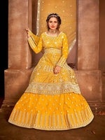 Myra Beautiful Mustard Yellow Heavy Embroidered Gharara SuitMustard Yellow Heavy Embroidered Gharara Suit features a butterfly net kameez, net bott...