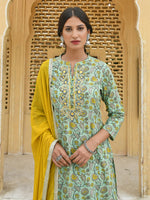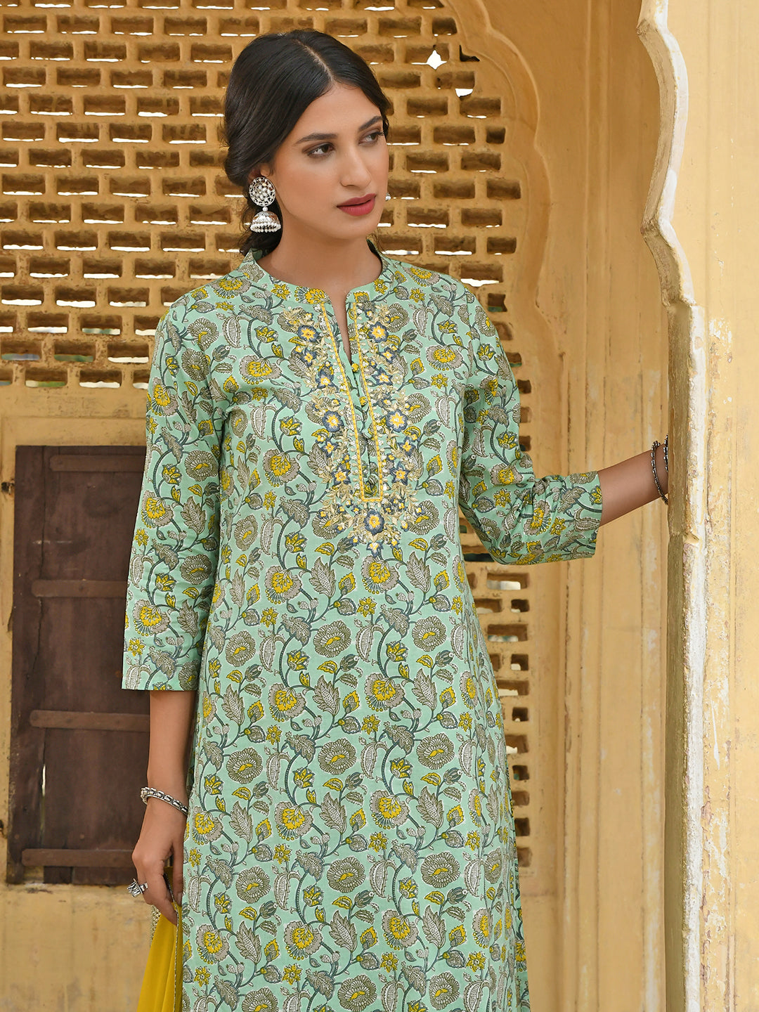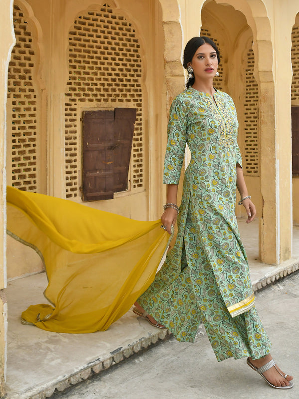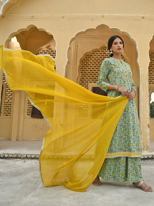 Embrace your aesthetics like an epitome of grace in this light green cotton floral print kurta with flared palazzo and dupatta by janasya featuring all-over floral prints, mandarin collar with thread embroidery on the yoke, 3/4th sleeves with straight fit kurta and gota detailing at the hemline. The flared palazzo is also crafted in cotton fabric with the floral prints including fully elasticated waistband. The set is paired with solid yellow chiffon dupatta with gota lace detailing over the borders.