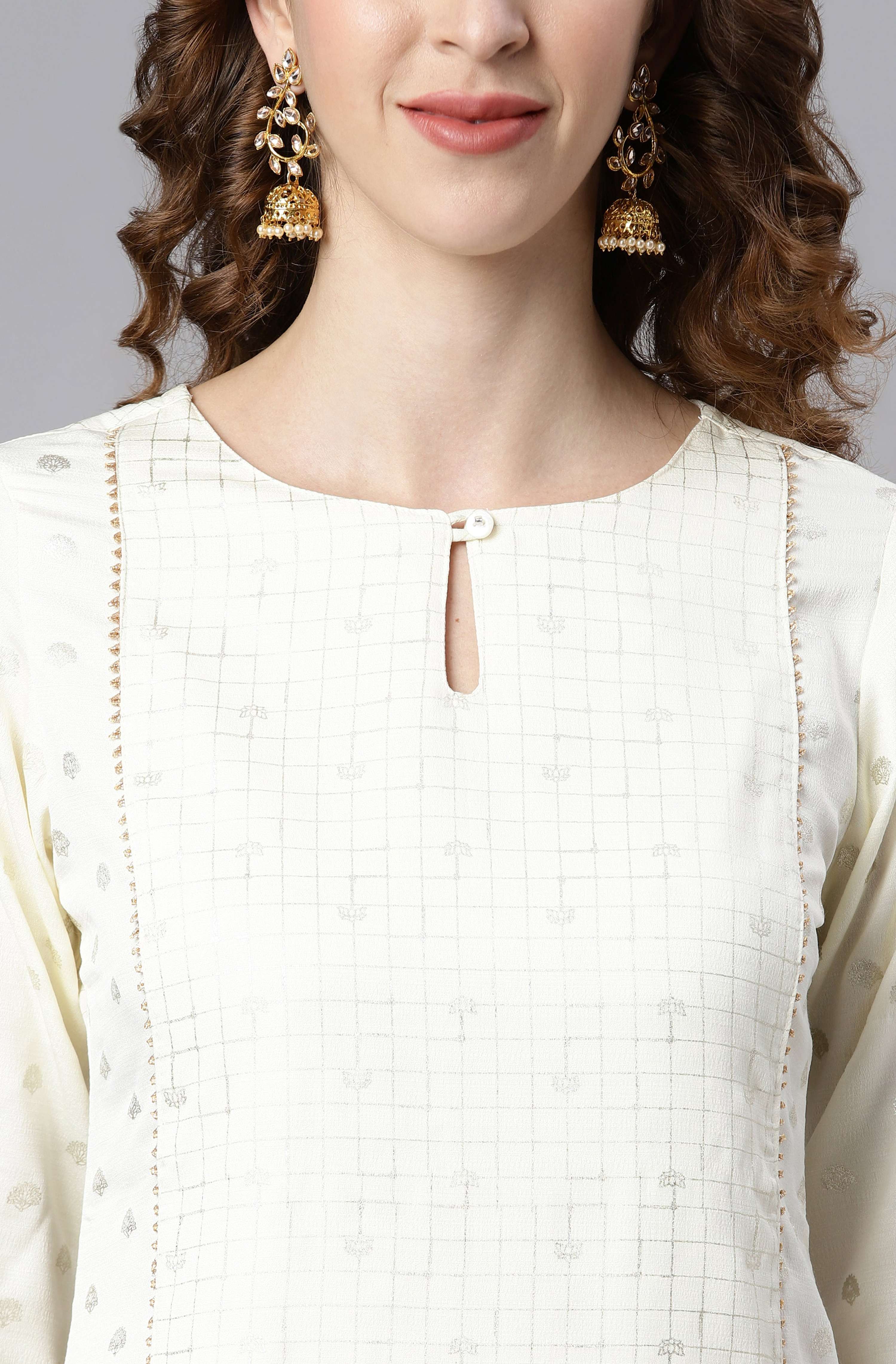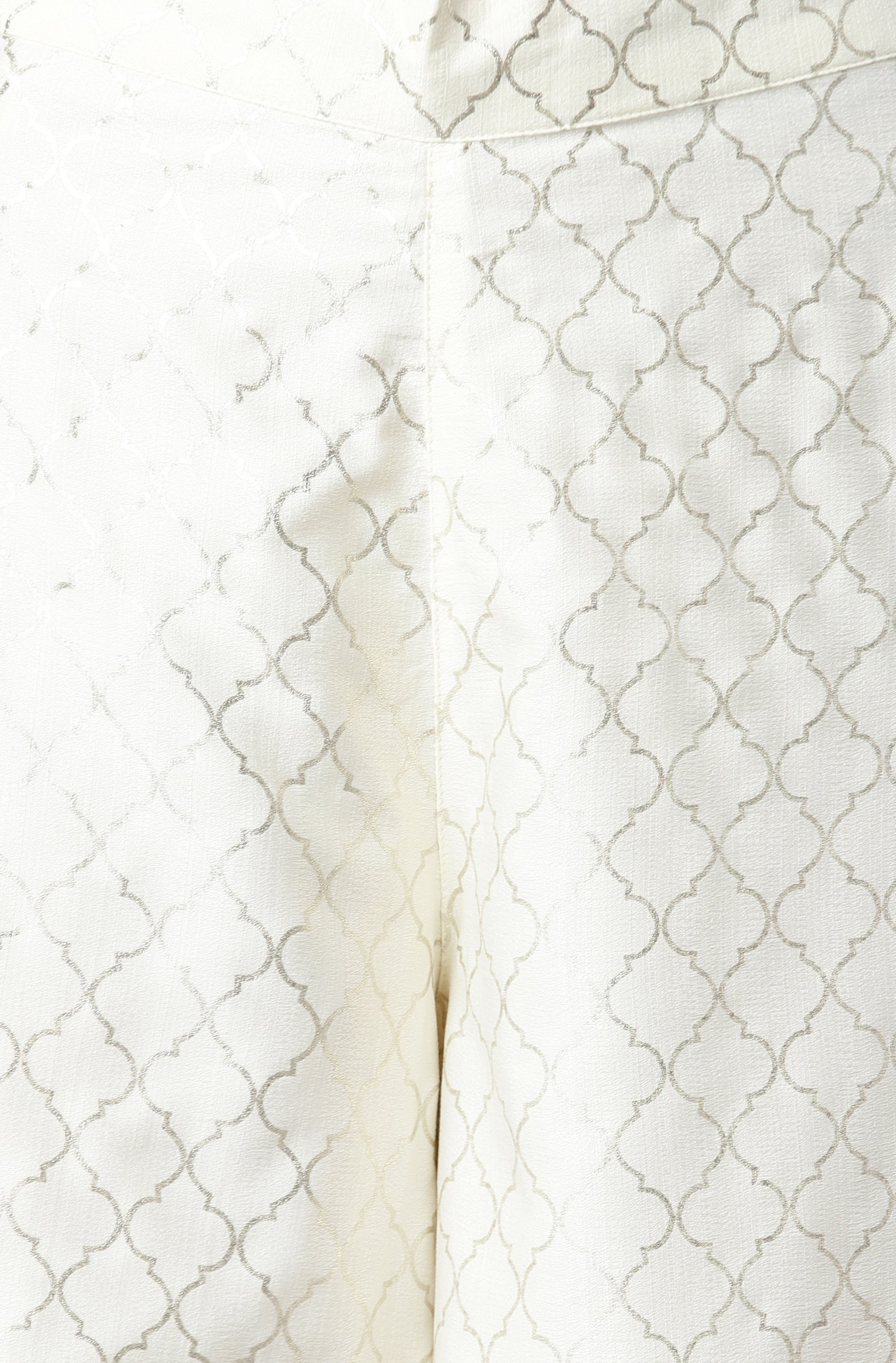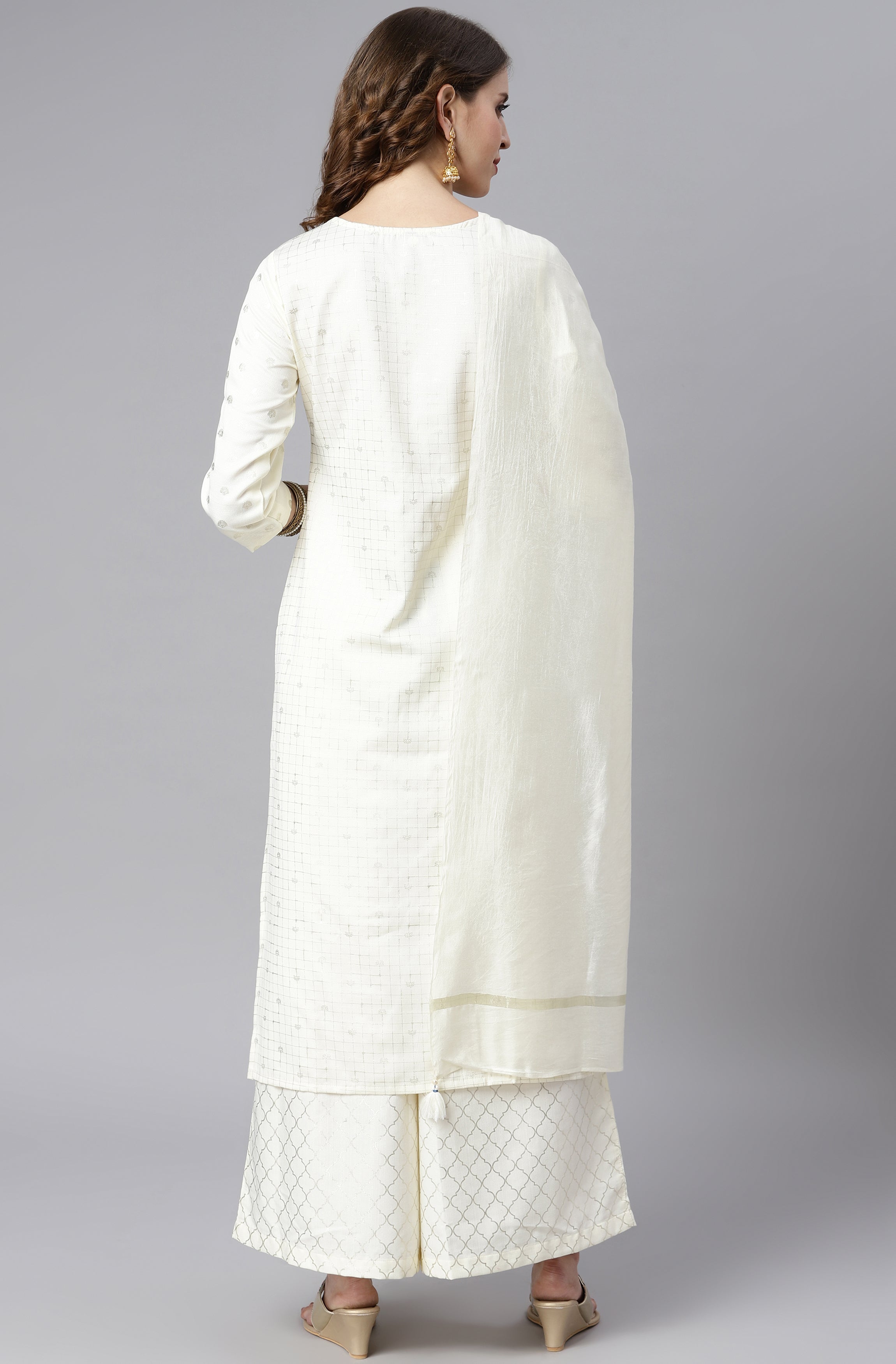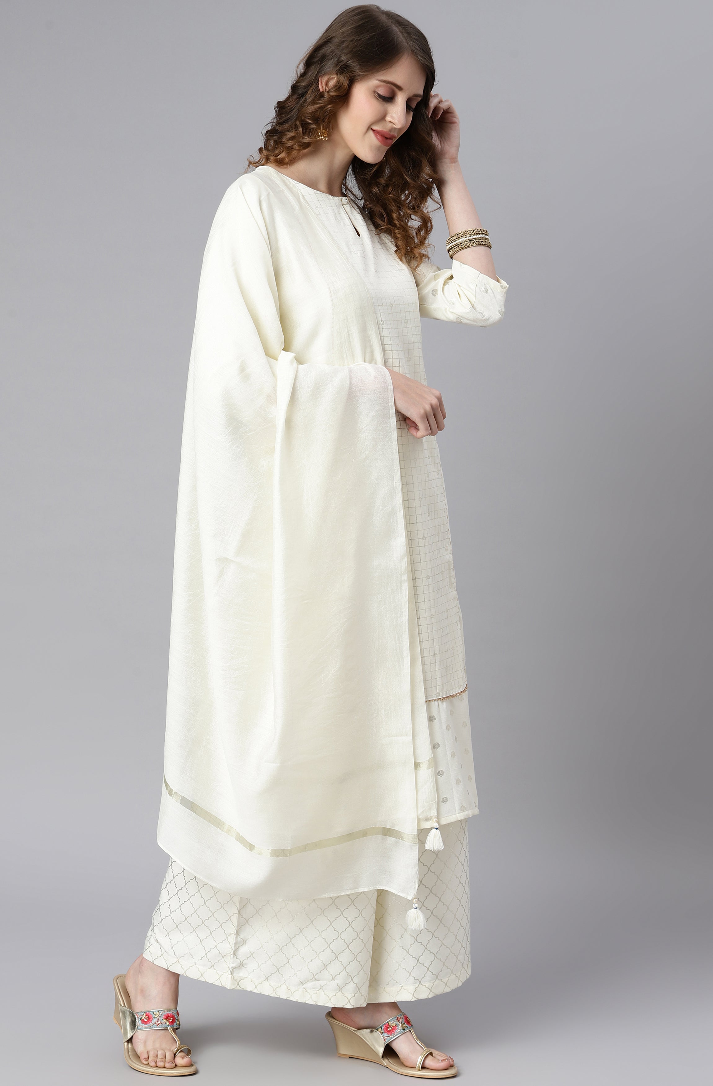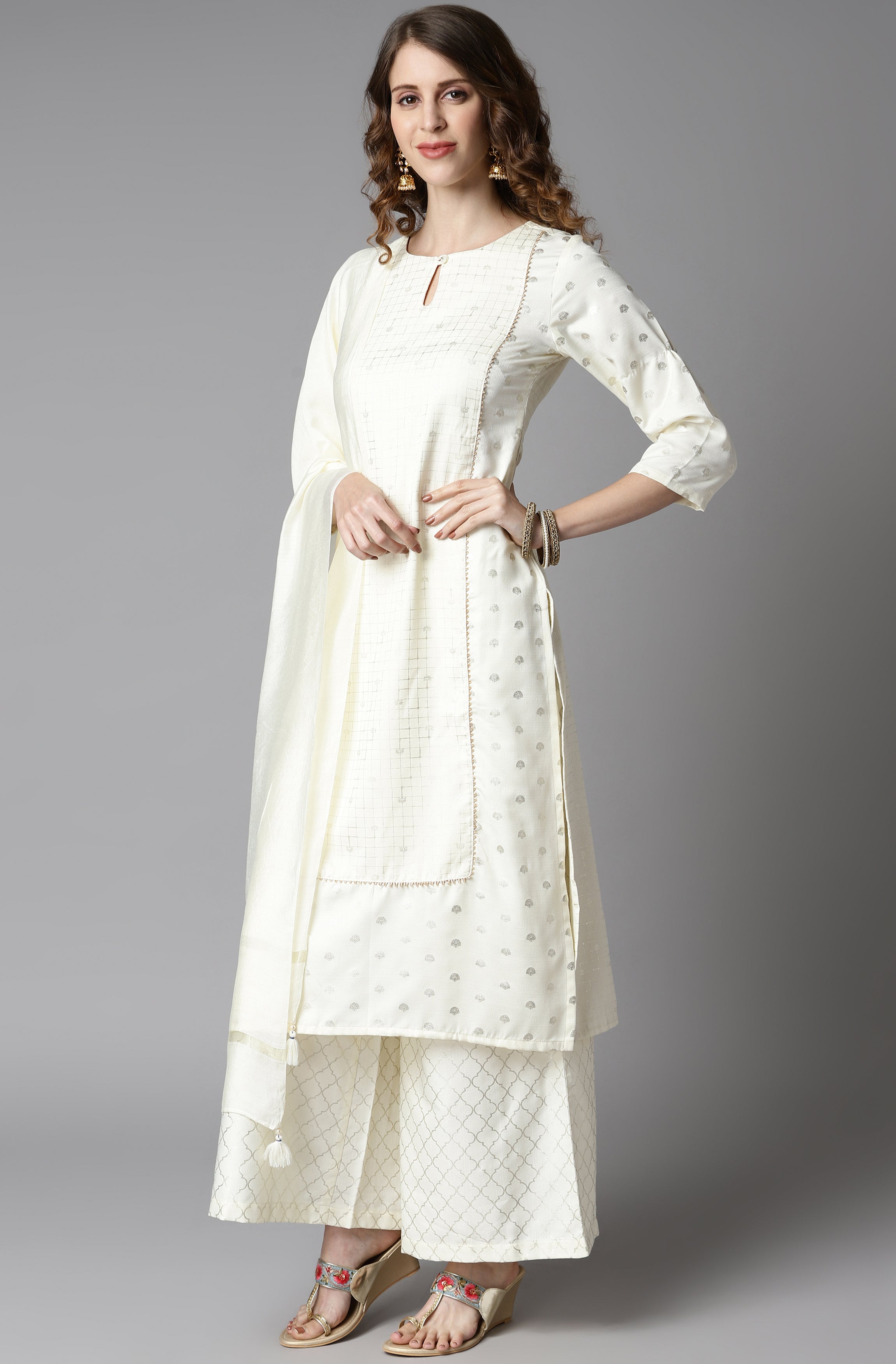 Classic, serene and flattering, the matchless beauty of white and gold combo stands the test of the time and continually changing fashion winds. Janasya created the magic of this timeless duo in this magnificent masterpiece of straight kurta set created in poly silk accentuated with gota lace, transparent beads and indian motifs inspired design. Complementing it, is a flared printed palazzo and off-white solid poly silk dupatta. Accessorise this classic look with evergreen jhumkas and mojris.