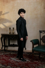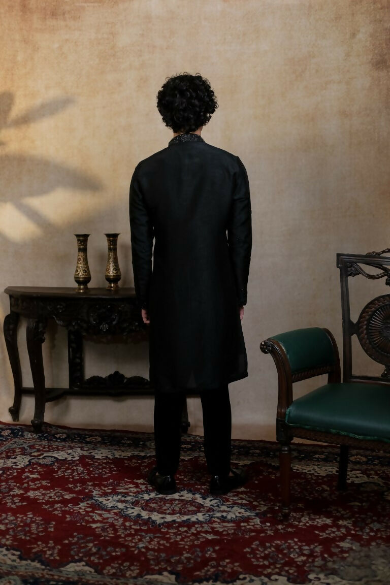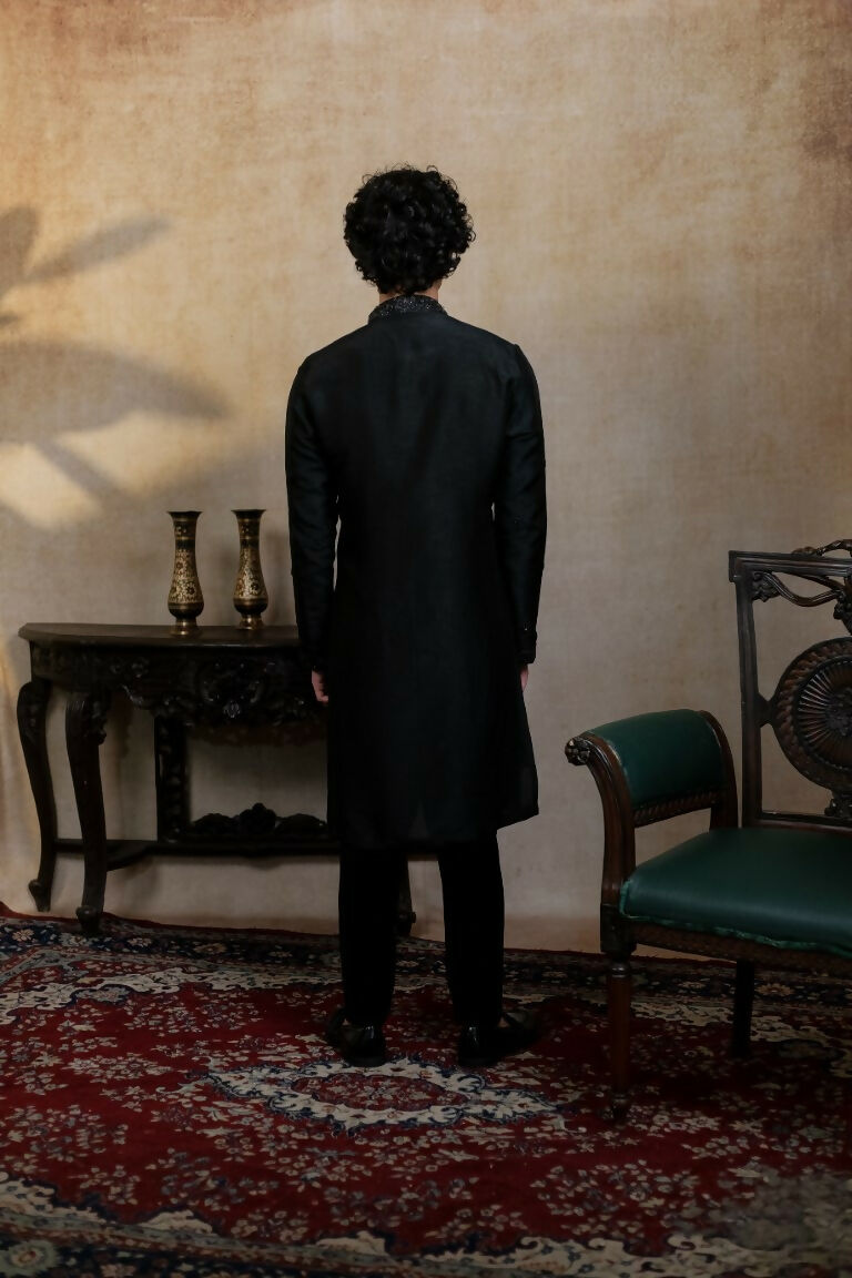 Falling Raw Silk Black Kajal Phool Kurta Set By Hilo DesignExude classic elegance with the Kajal Phool Kurta Set, tailored in luxurious falling raw...