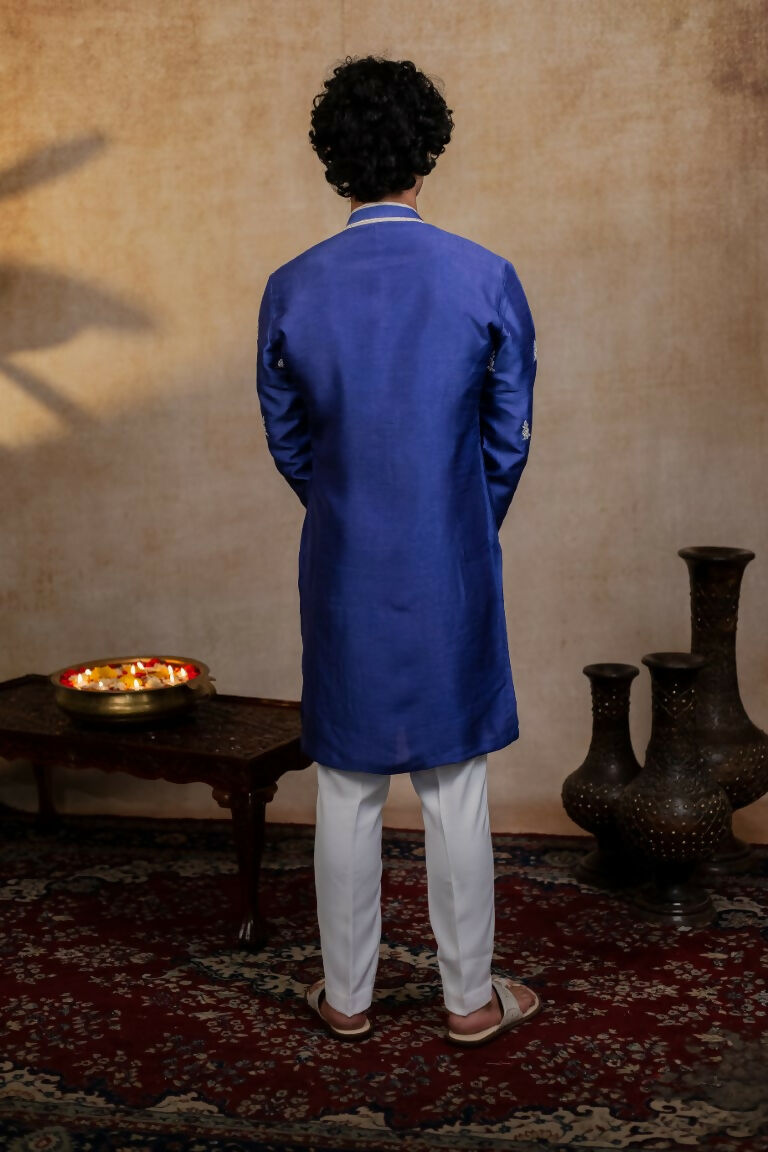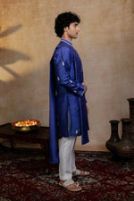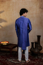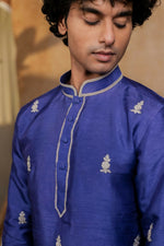 Falling Raw Silk Dark Blue Silver Stitches Kurta Set By Hilo Design