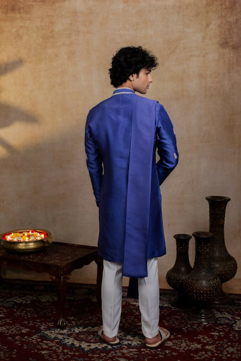 Falling Raw Silk Dark Blue Silver Stitches Kurta Set By Hilo Design - S