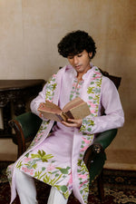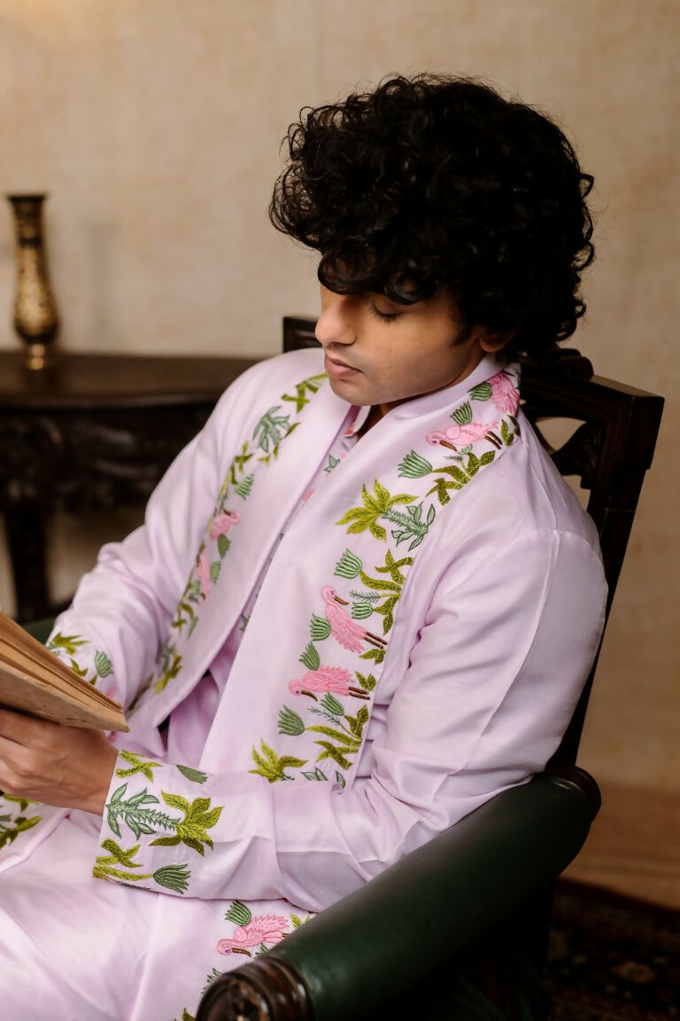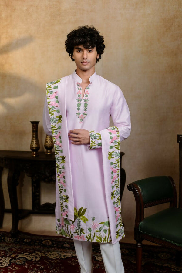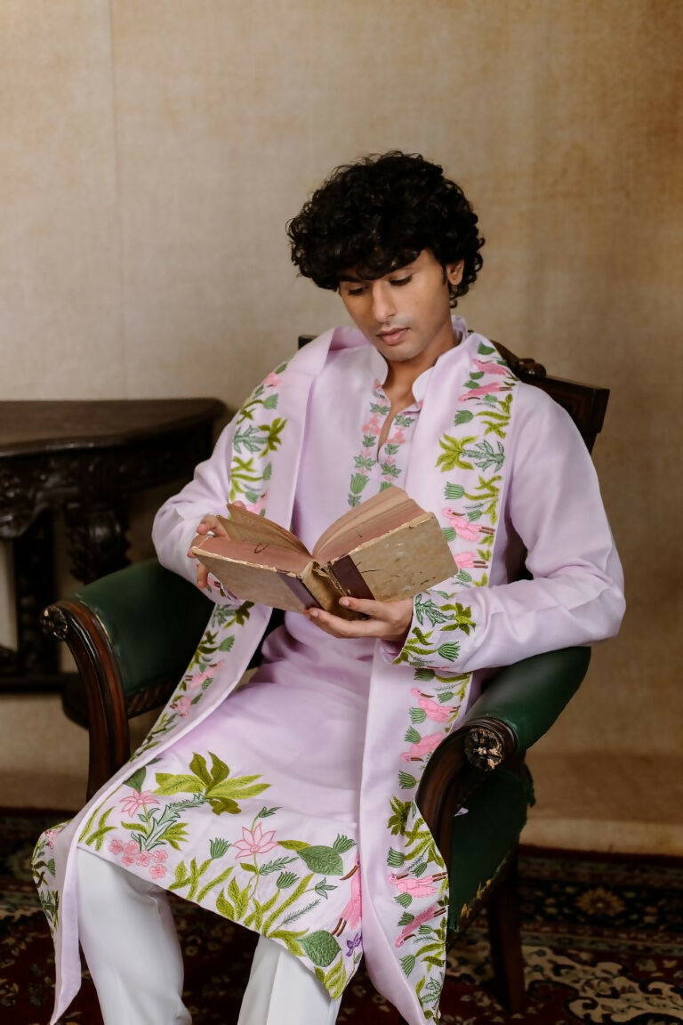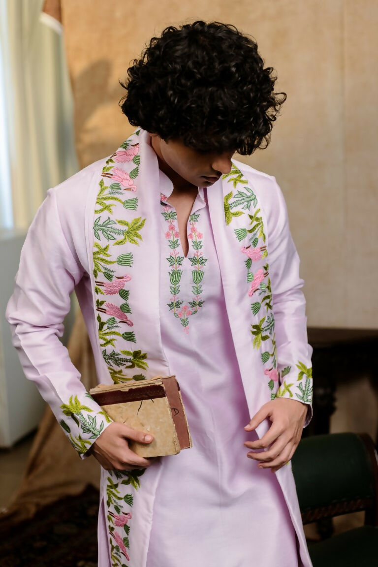 Falling Raw Silk Lavinder Taruni Hamsa Kurta Set By Hilo DesignThe Taruni Hamsa Kurta Set is a refined ensemble that blends tradition with elegance...