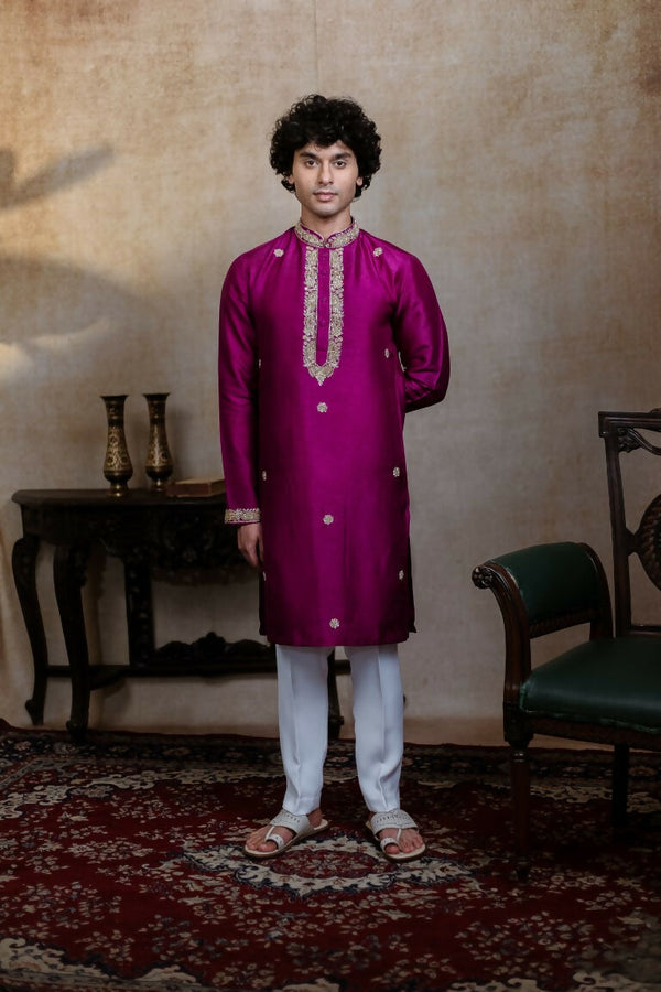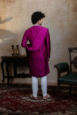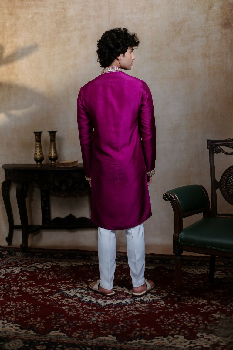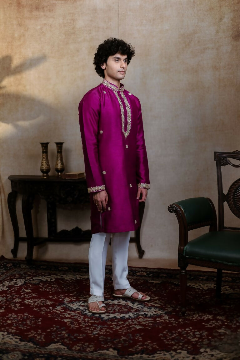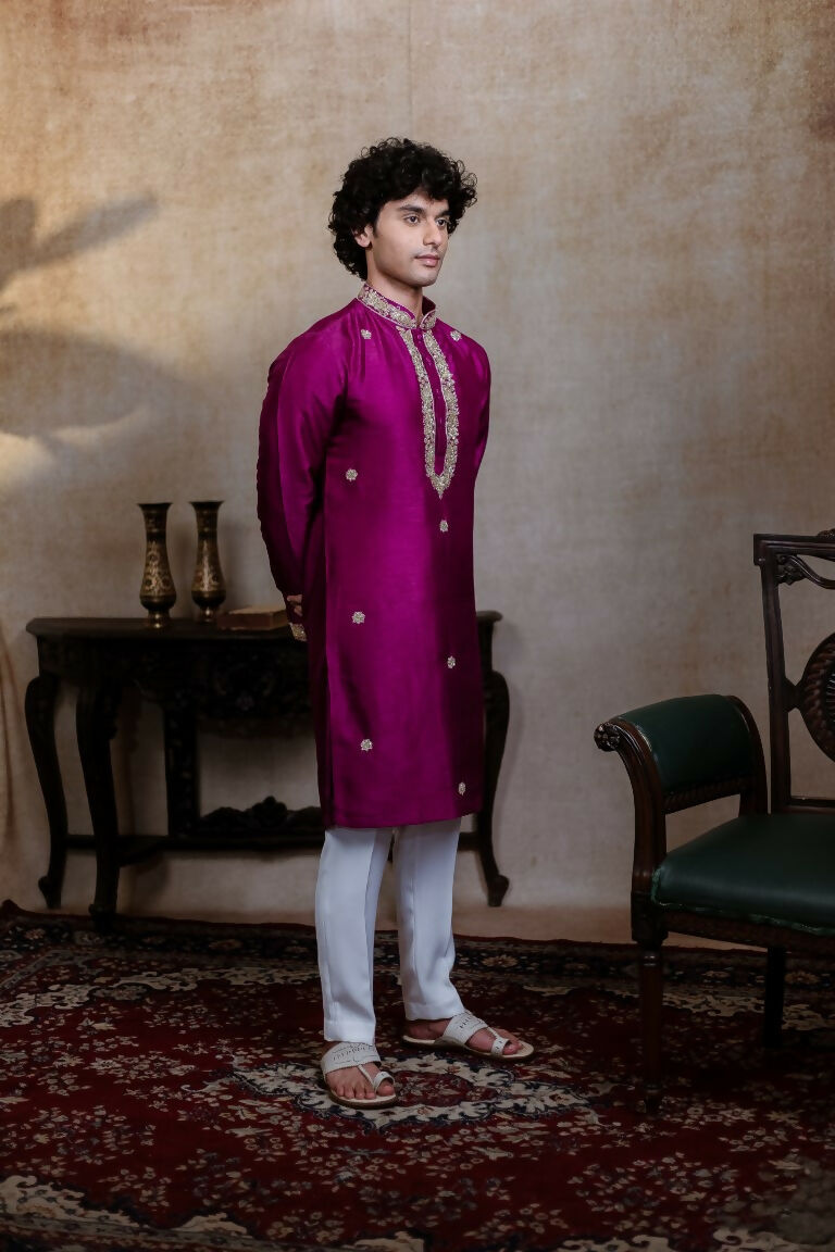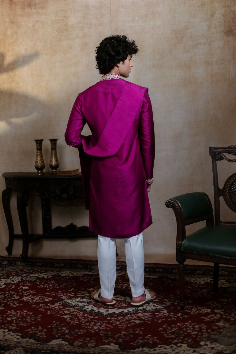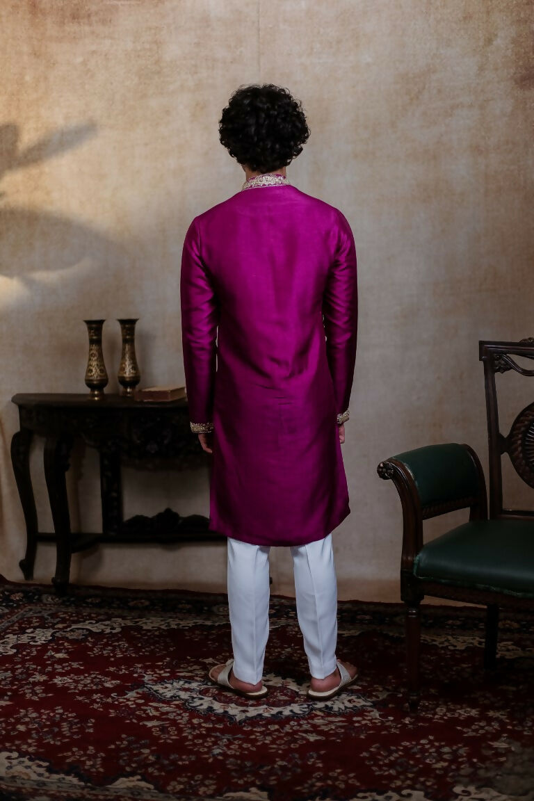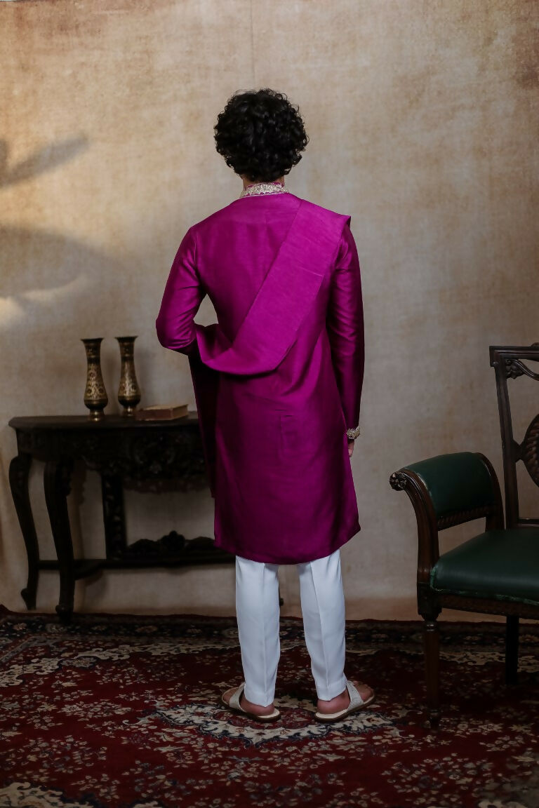 Falling Raw Silk Magenta Perple Rajyog Kurta Set By Hilo Design