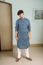 Souchii Men's Ethnic Printed Pure Cotton Kurta – Indigo Leaf Motif