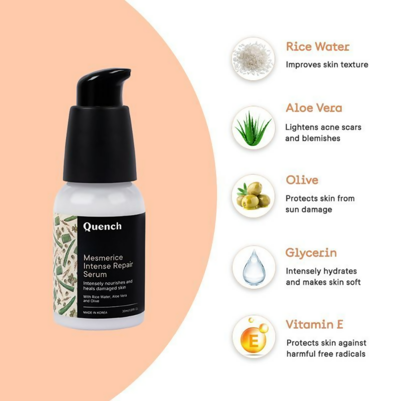 Quench Rice Water Intense Repair Serum With Niacinamide For Dewy & Even Skin ToneIngredients: Rice Water Aloe Vera Olive Glycerin Vitamin E How...
