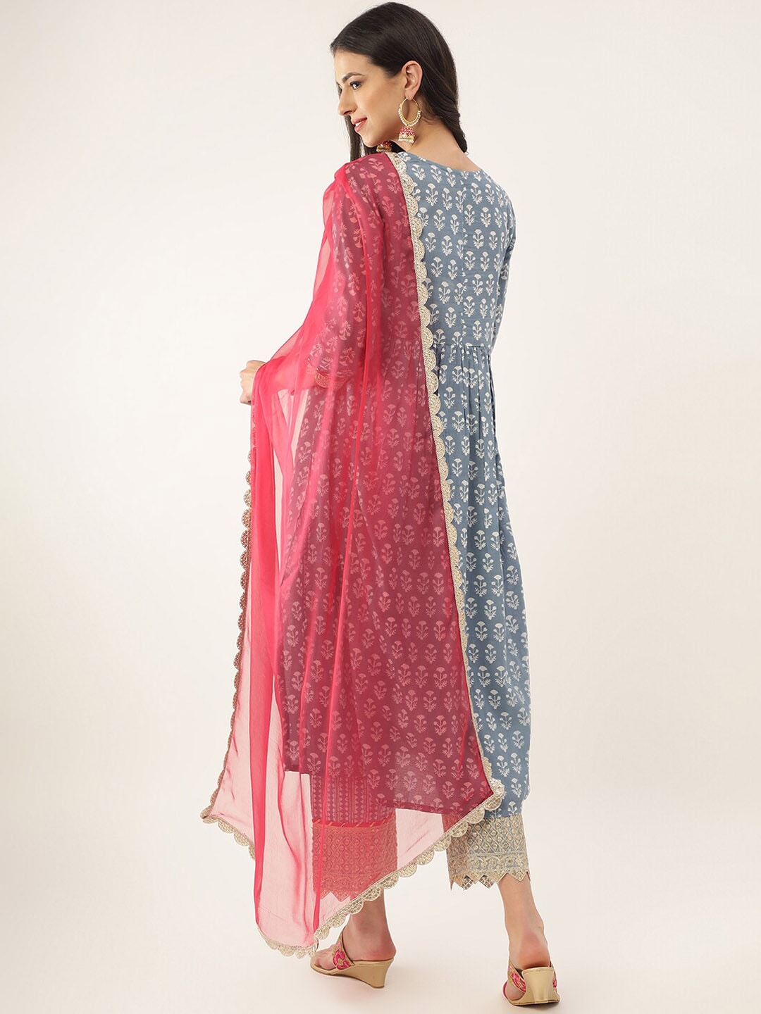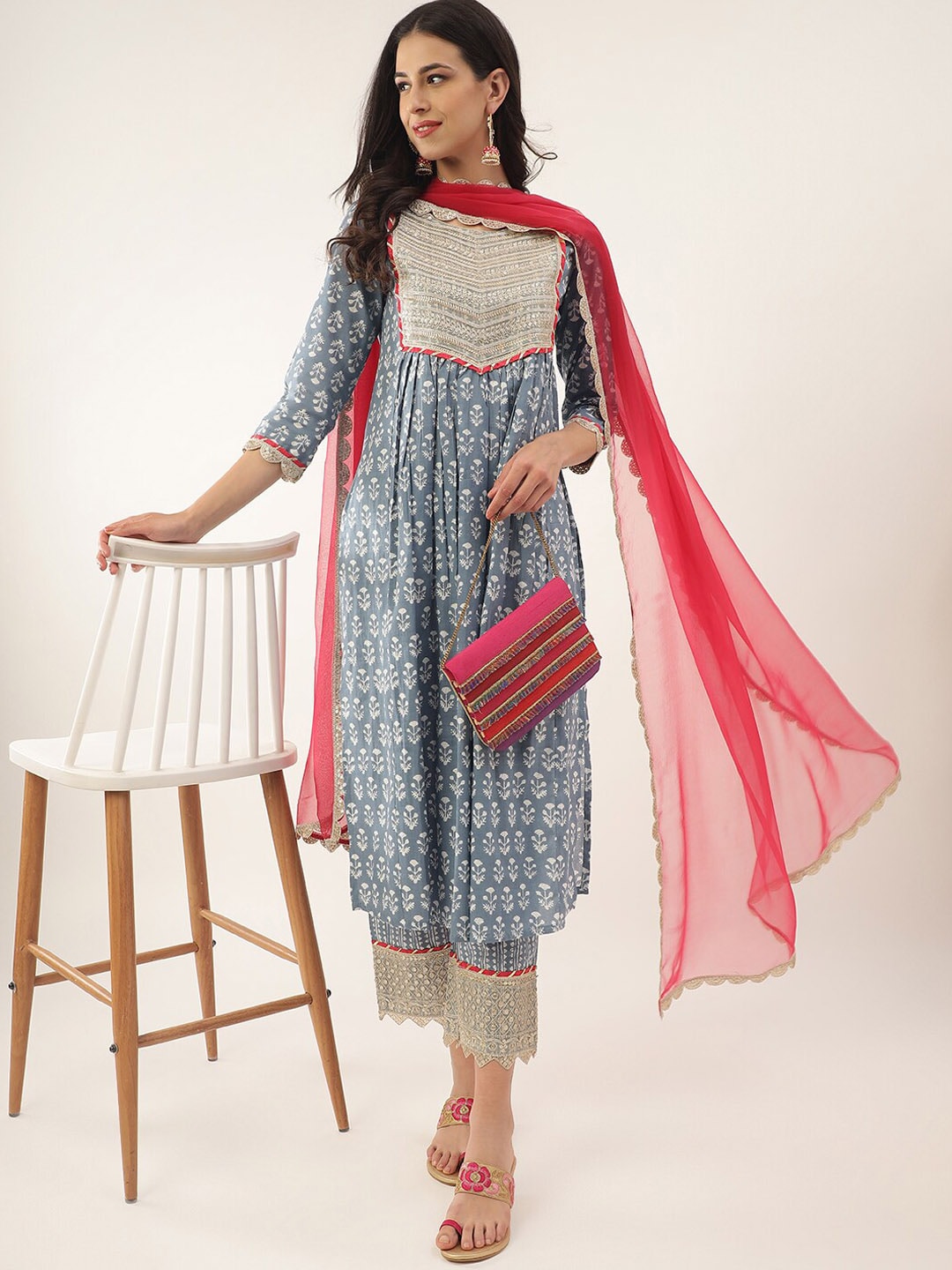 Khushal K Floral Printed Zari Sequined A-Line Pure Cotton Kurta with Palazzos & Dupatta Product Details Blue, white and red printed Kurta wi...
