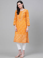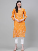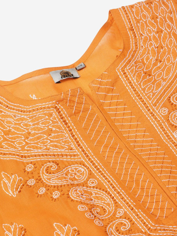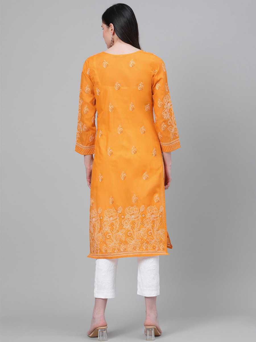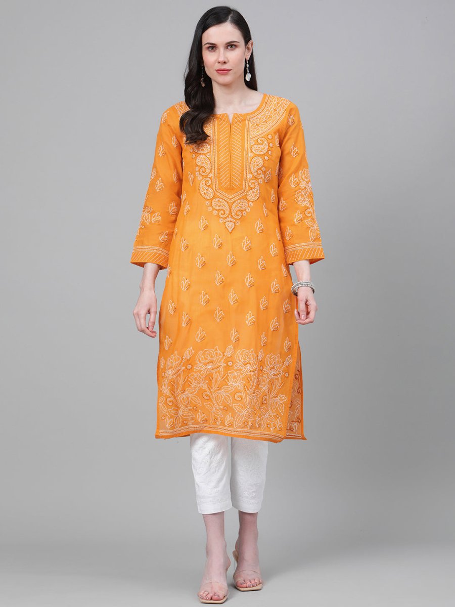 Mustard yellow with a tinge of orange and white straight calf length chikankari embroidered kurta, has a round neck, long sleeves, straight hem, side slits