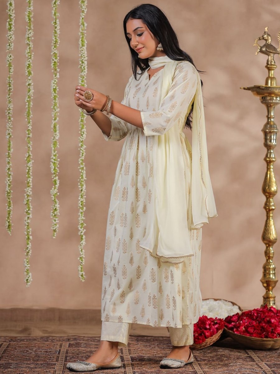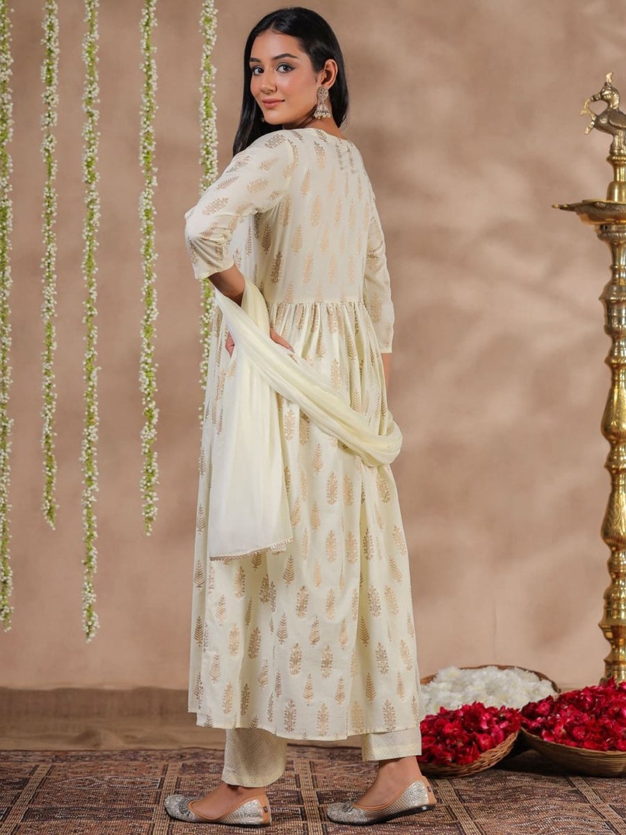 Anubhutee Ethnic Motifs Pure Cotton Kurta & Palazzos With Dupatta Product Details Off white, gold toned printed kurta with palazzos with dup...