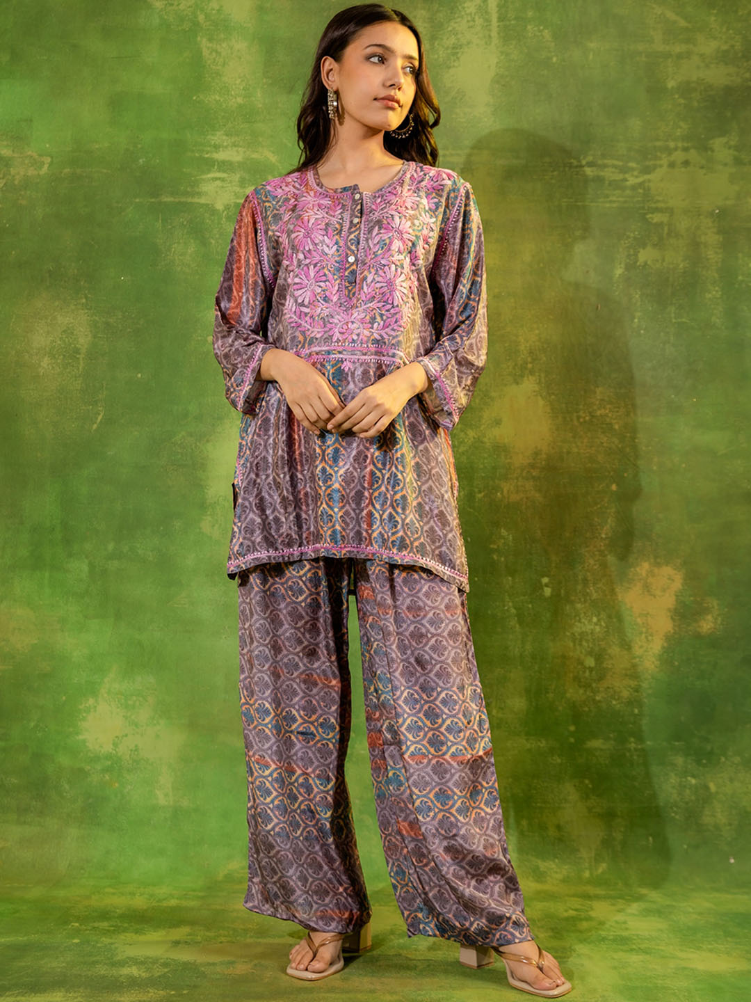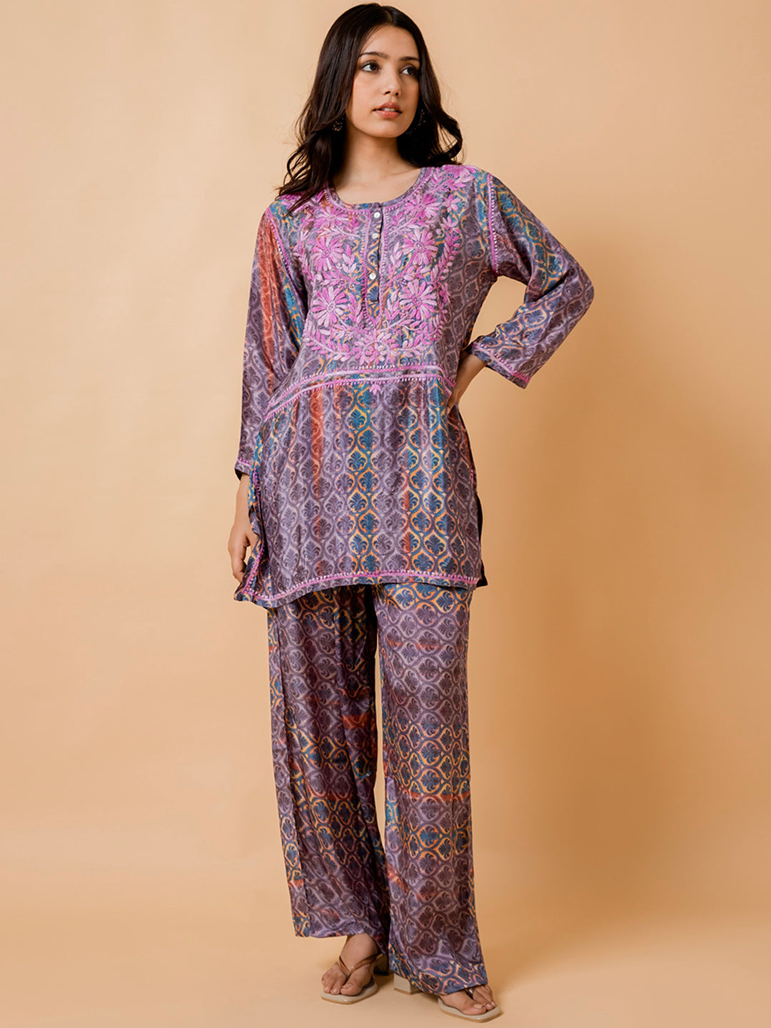 HOUSE OF KARI Floral Embroidered Regular Chikankari Straight Kurta with Palazzos Product Details Purple embroidered Kurta with Palazzos Kurta...