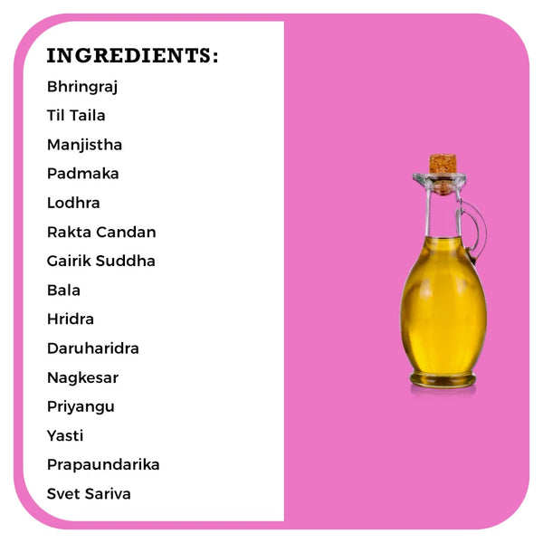 Key Ingredients: Bhringaraj, Til Taila, Manjistha, Padmaka, Lodhra, Rakta Candan, Gairik Suddha, Bala, Haridra, Daruharidra, Nagkesar, Priyangu, Yasti, Prapaundarika, Svet Sariva.