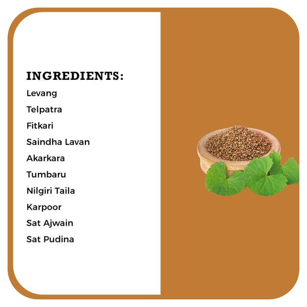 Key Ingredients– Lavang, Tejpatra Bark, Fitkari, Saindha Lavan, Souvarchar Lavan, Akarkara, Tumbaru, Nilgiri Taila, Karpoor Sat Ajwain & Sat Pudina.