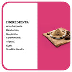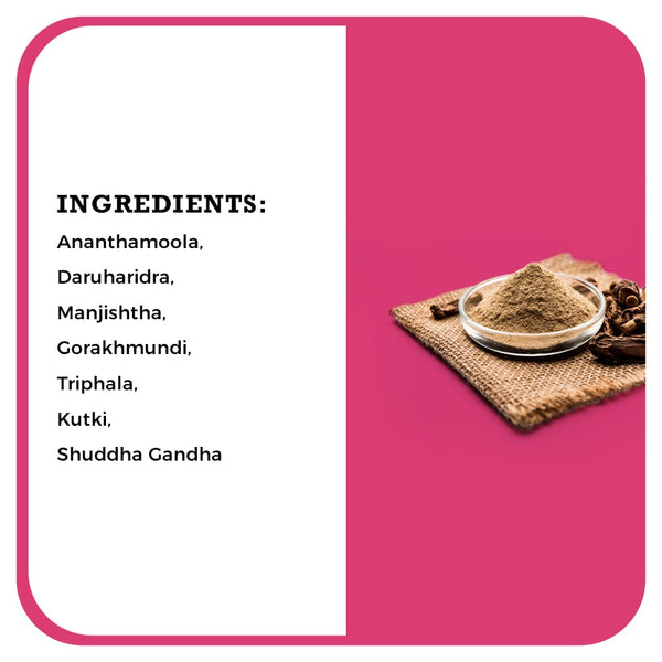 Key Ingredients– Ananthamoola, Daruharidra, Manjishtha, Gorakhmundi, Triphala, Kutki, Shuddha Gandha