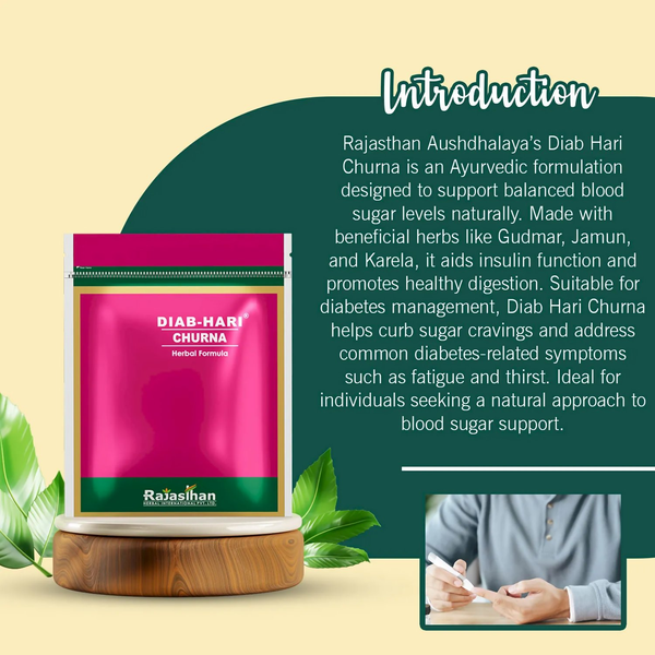 • Diab Hari Churna by Rajasthan Herbal is an Ayurvedic Medicine for Diabetes, that offers a natural solution to control blood sugar levels effectively. Formulated with time-tested herbs, this Ayurvedic remedy provides holistic care for diabetes management without side effects. It not only supports balanced blood sugar but also aids in improving overall health and vitality.