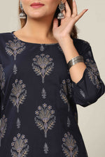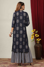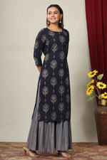 Miravan Women's Blue & Grey Printed Pure Cotton Kurta With ShararaYou are bound to make a powerful fashion statement with this navy blue sharar...