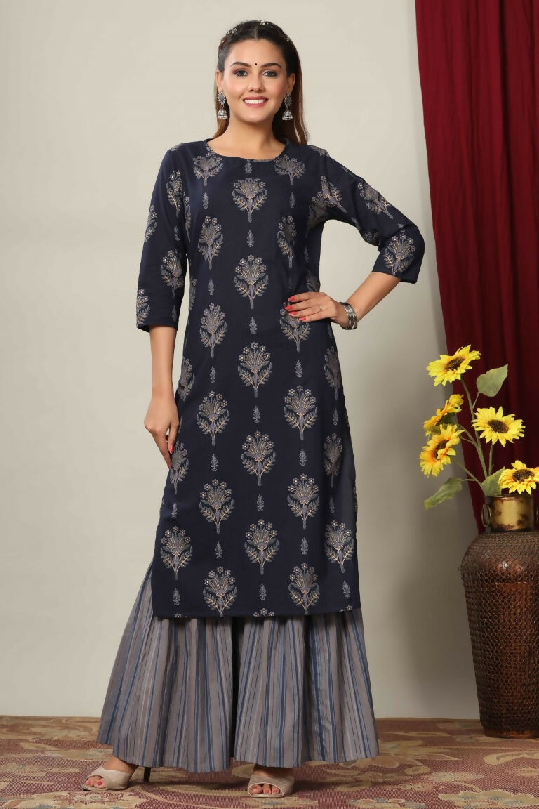 Miravan Women's Blue & Grey Printed Pure Cotton Kurta With Sharara