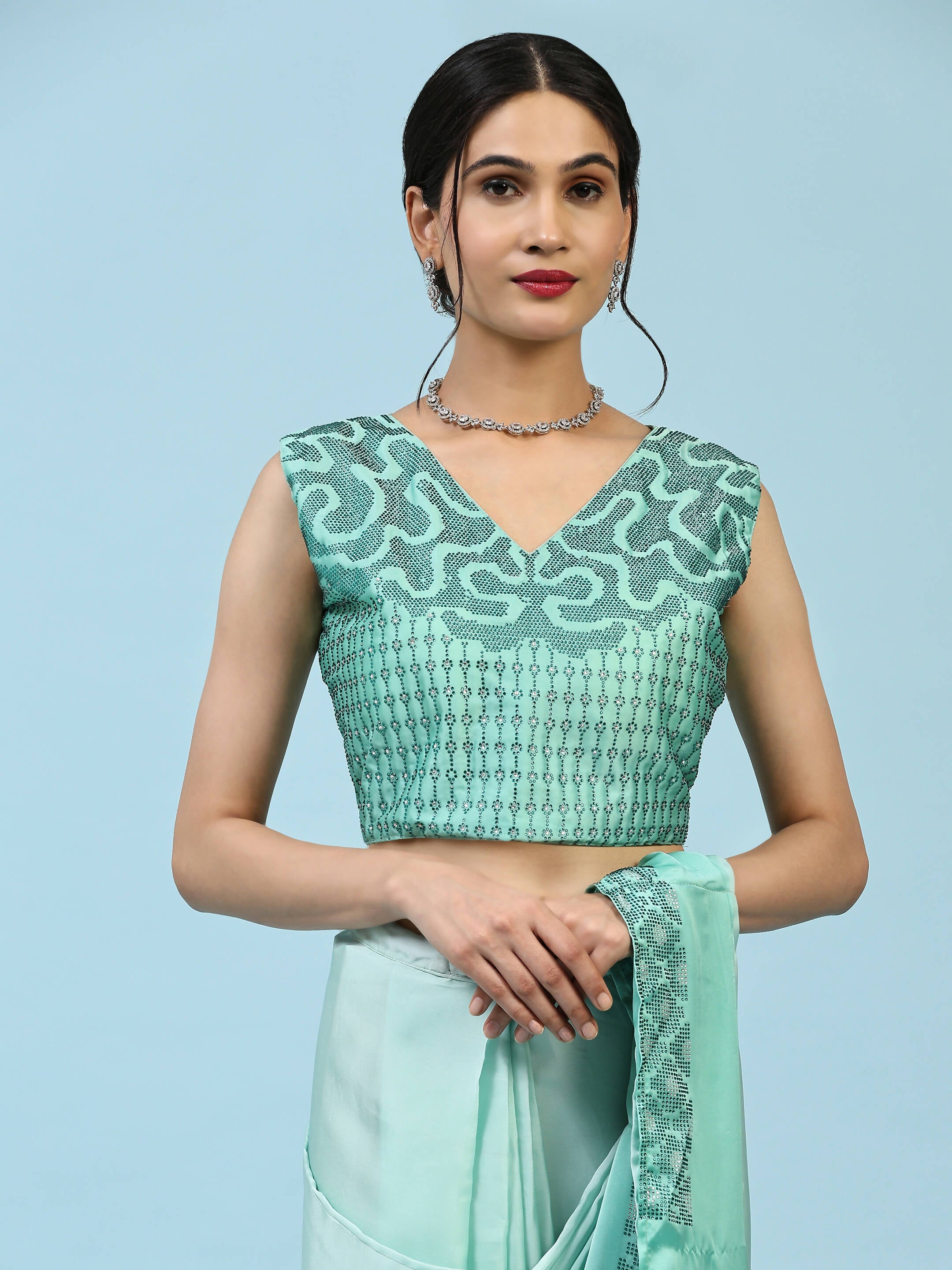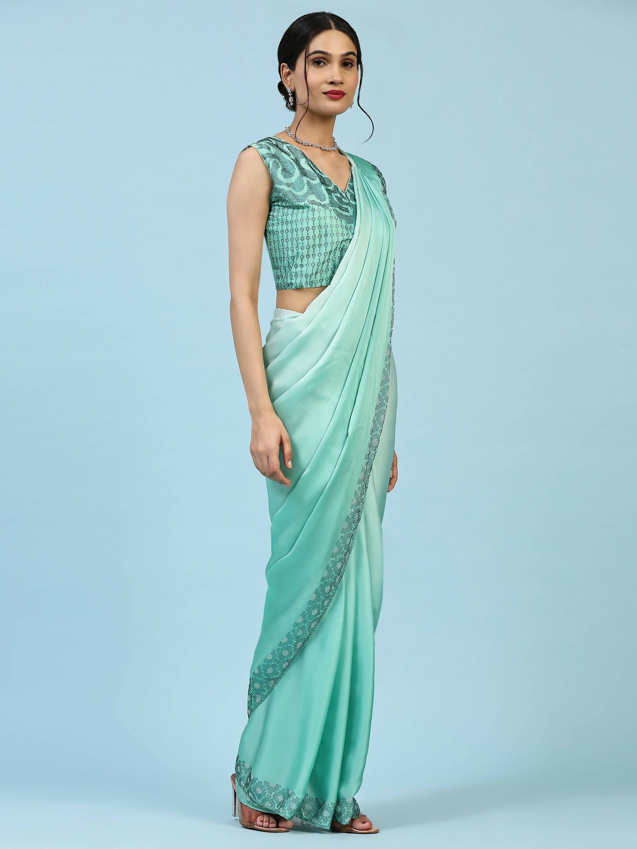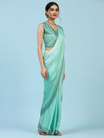 Sea Green Ombre Satin Georgette Plain Ready to wear Saree with stitched Blouse - Vrinda