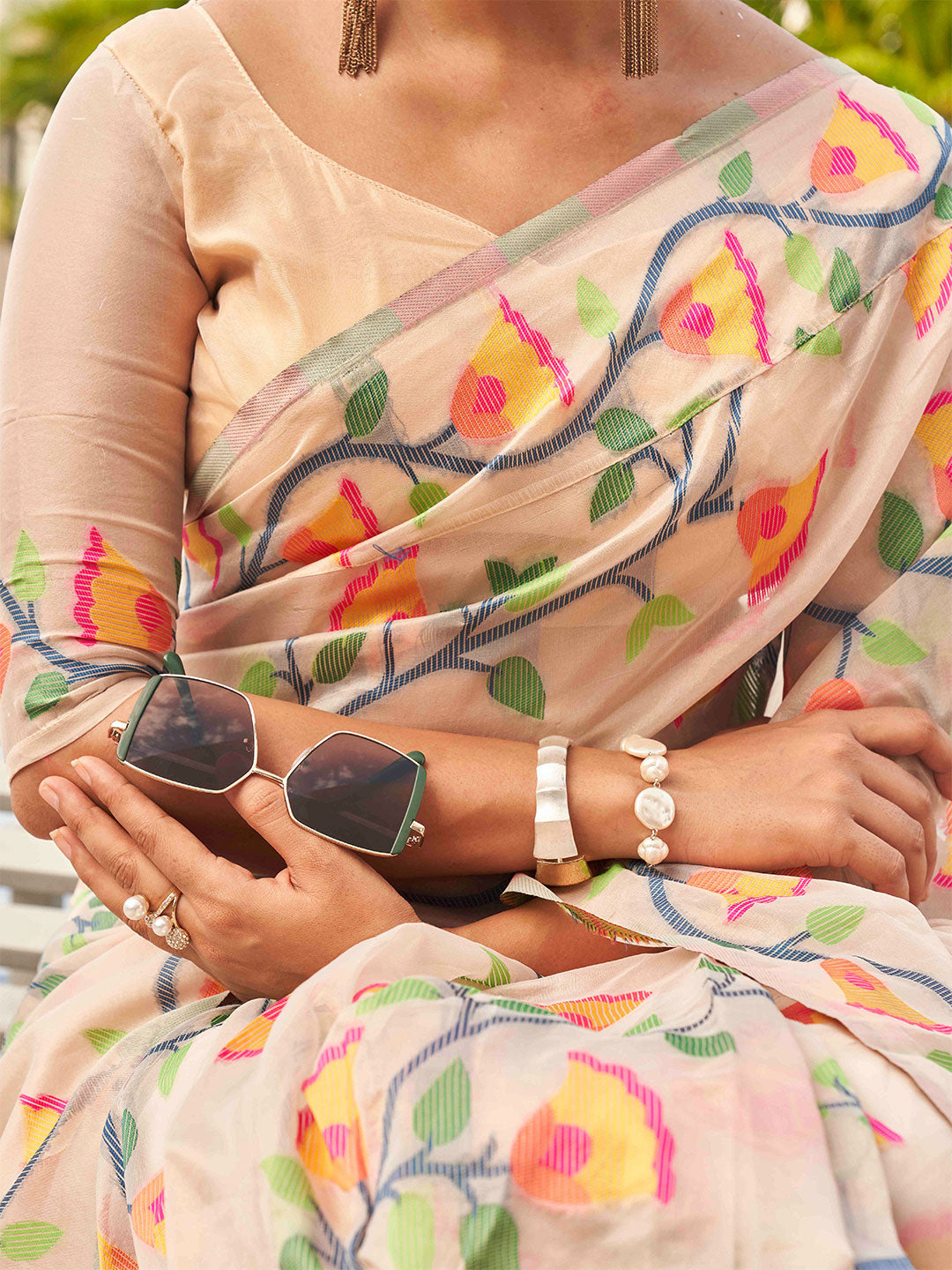 Tikhi Imli Floral Organza Ready to wear Saree Product Details Design Details Cream-coloured and yellow saree Floral woven design saree wi...