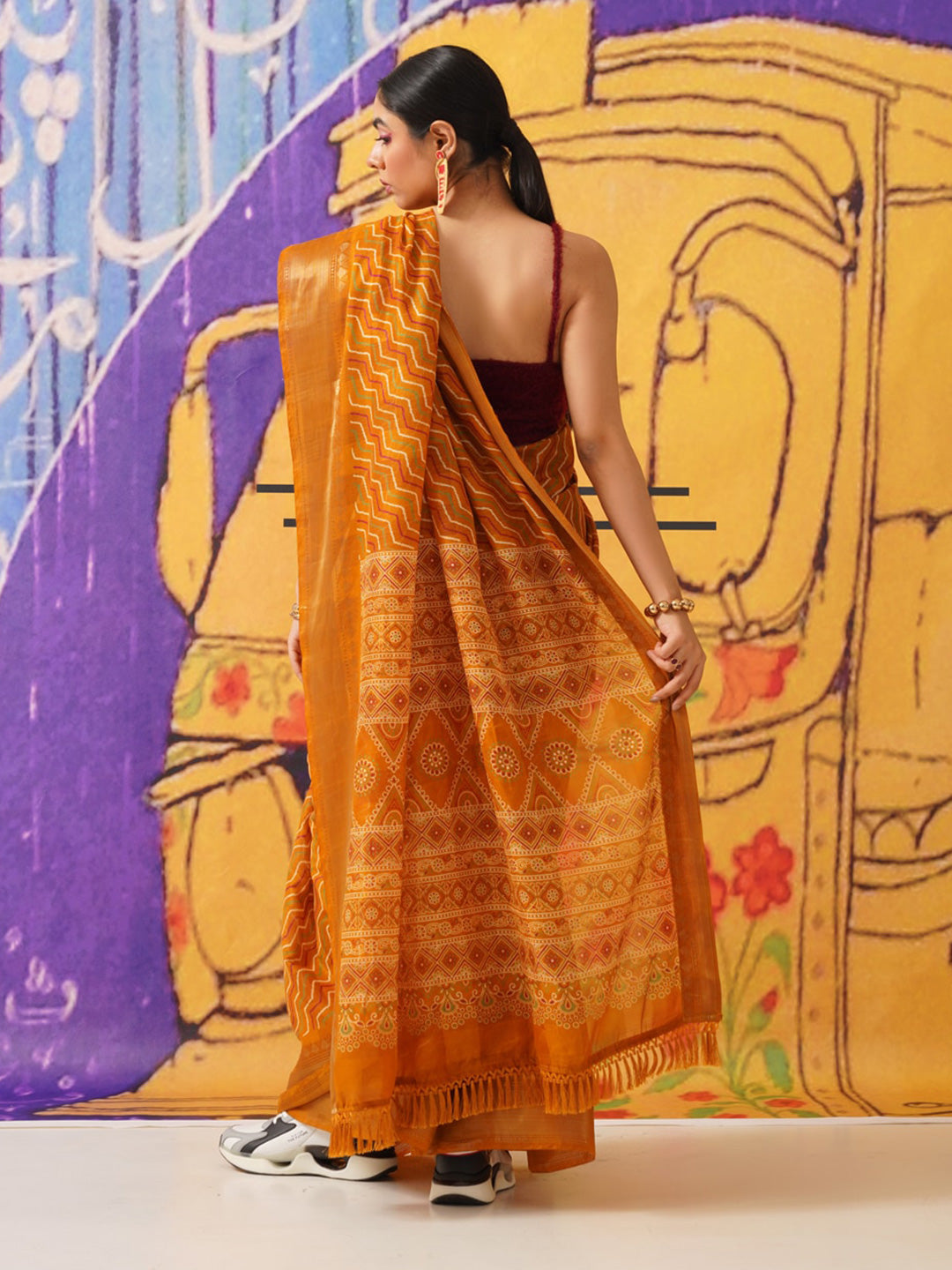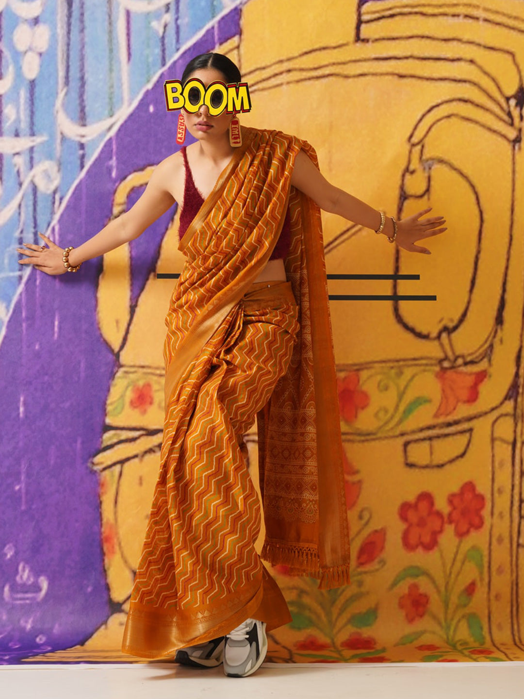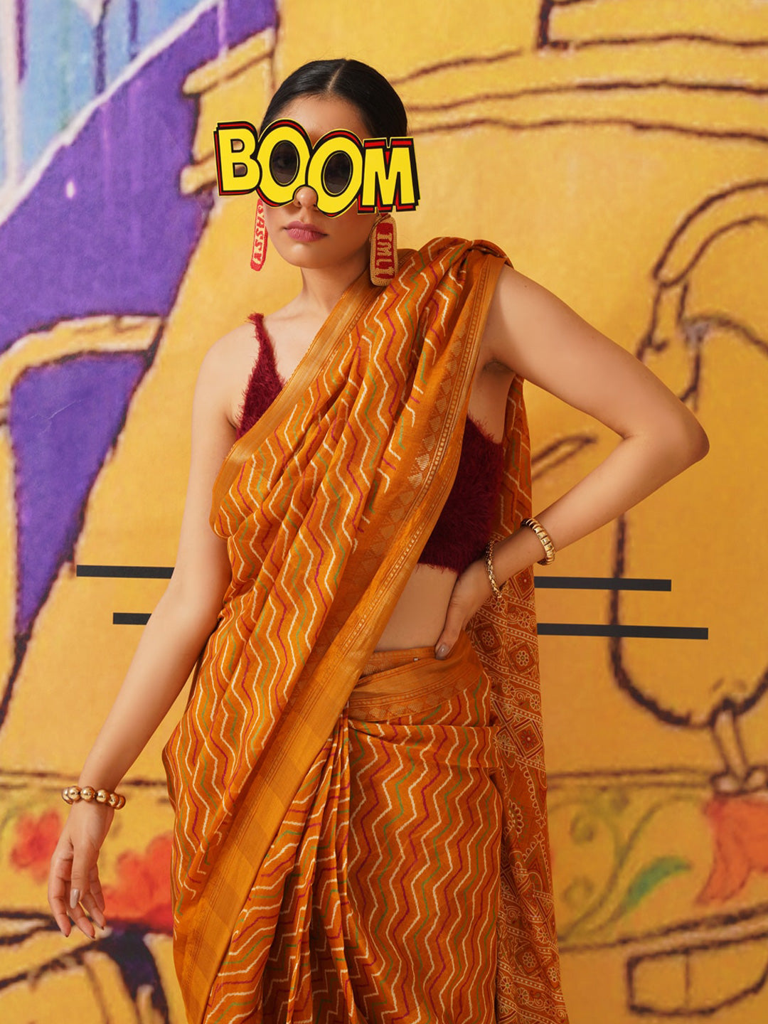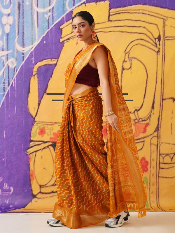 Tikhi Imli Leheriya Zari Jute Silk Ready to Wear Saree Product Details Design Details Mustard and red saree Leheriya printed saree with w...