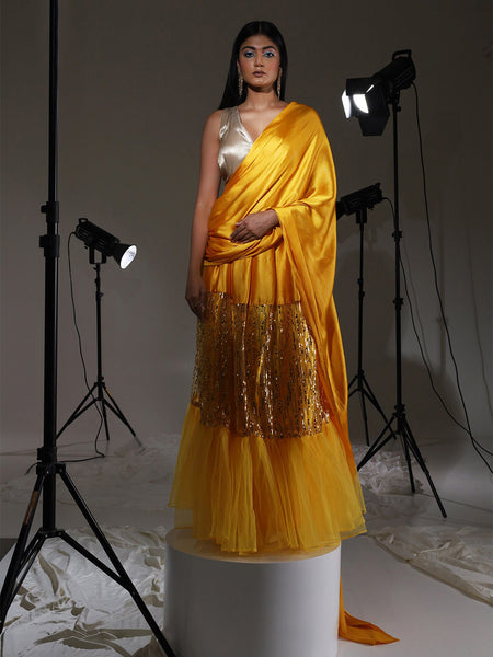 Tikhi Imli Satin embroidered Ready to Wear Saree Product Details Design Details Yellow saree Solid embroidered saree with no border borde...