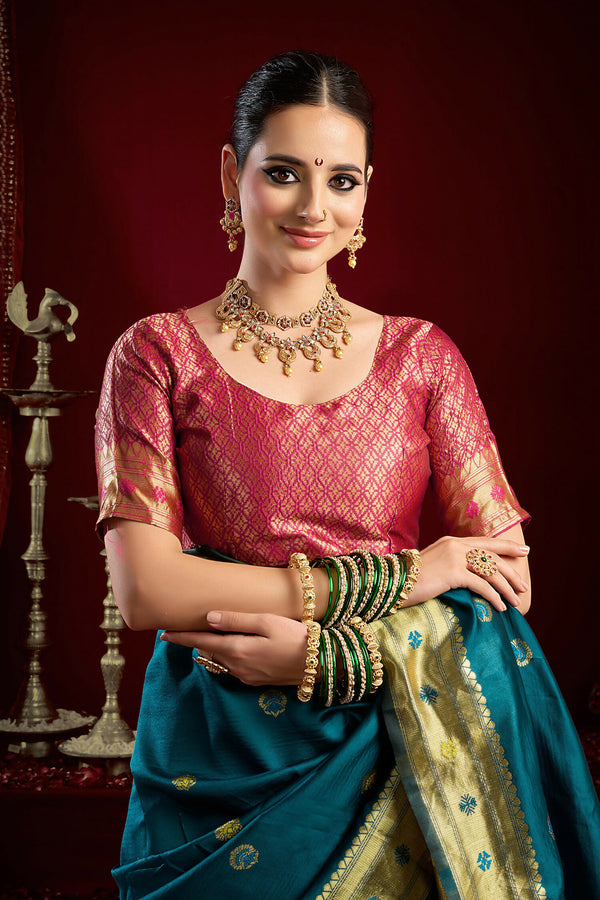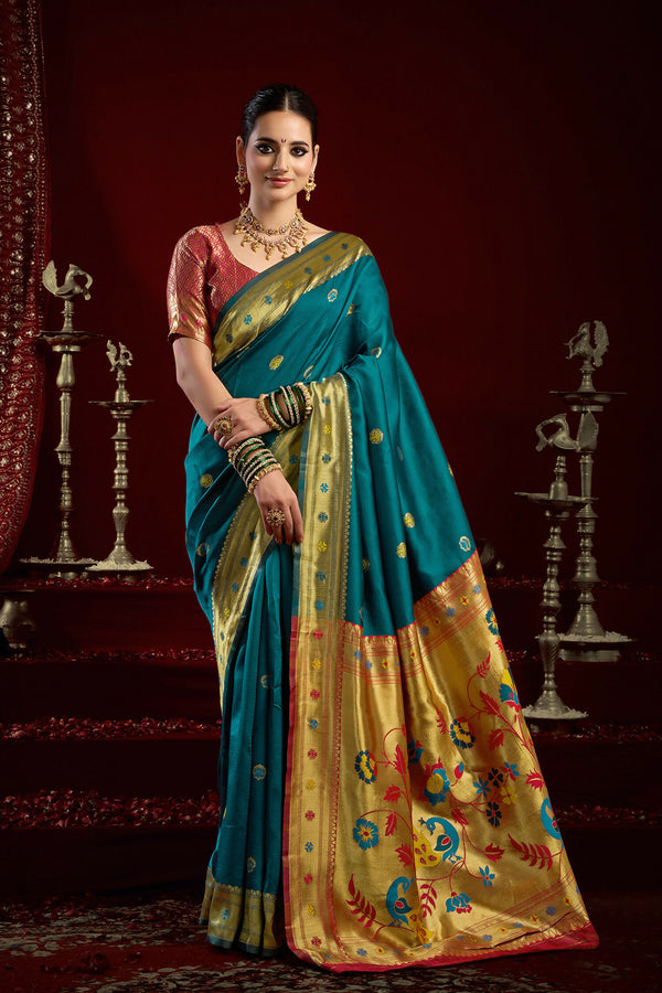 Joban Fashion Teal Paithani Silk Blend Butti Saree