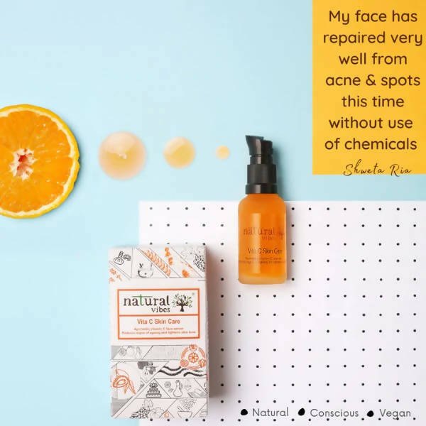 Natural Vibes Ayurvedic Vitamin C Skin Care Serum is a plant-based serum inspired by traditional Ayurvedic formulations. Enriched with Amla, Lemon, Orange, Peach, Aloe Vera, and Grape Seed, this serum is designed for daily skin care routines. It has a lightweight texture that can be layered under moisturizers or makeup and is suitable for various skin types.