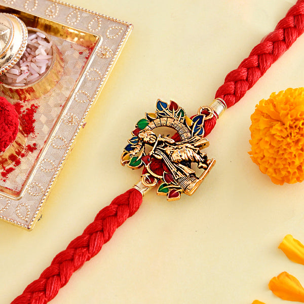 • A beautiful and colorful thread Rakhi, designed for those who keep traditions close to heart. Featuring a Radha Krishna motif and high polish, the Rakhi is perfect to celebrate the special bond between siblings.