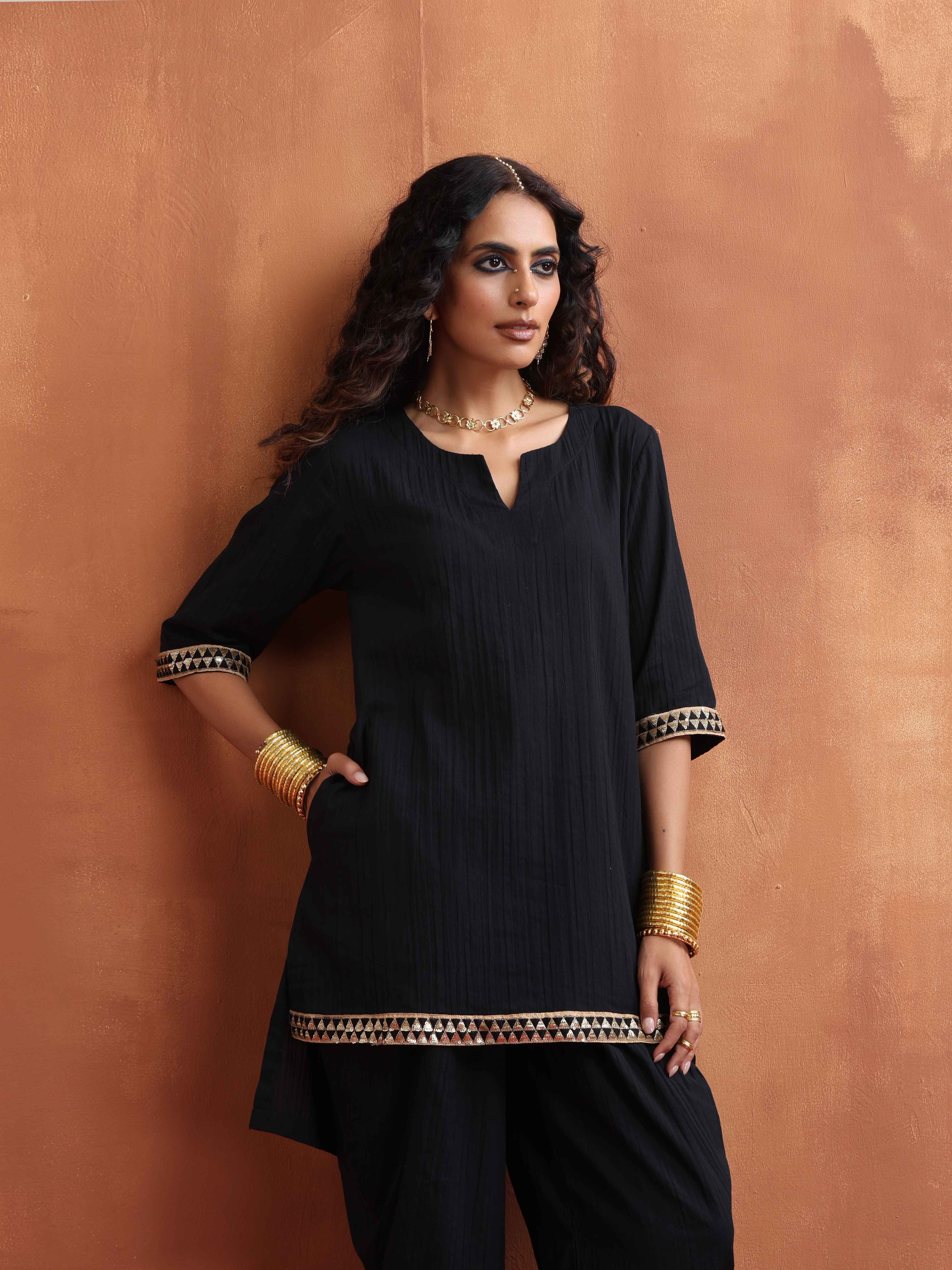 trueBrowns Black Cotton Co-ord SetDescription Elevate your style with this black cotton kurta paired with black cotton dhoti pant It's an ideal bl...