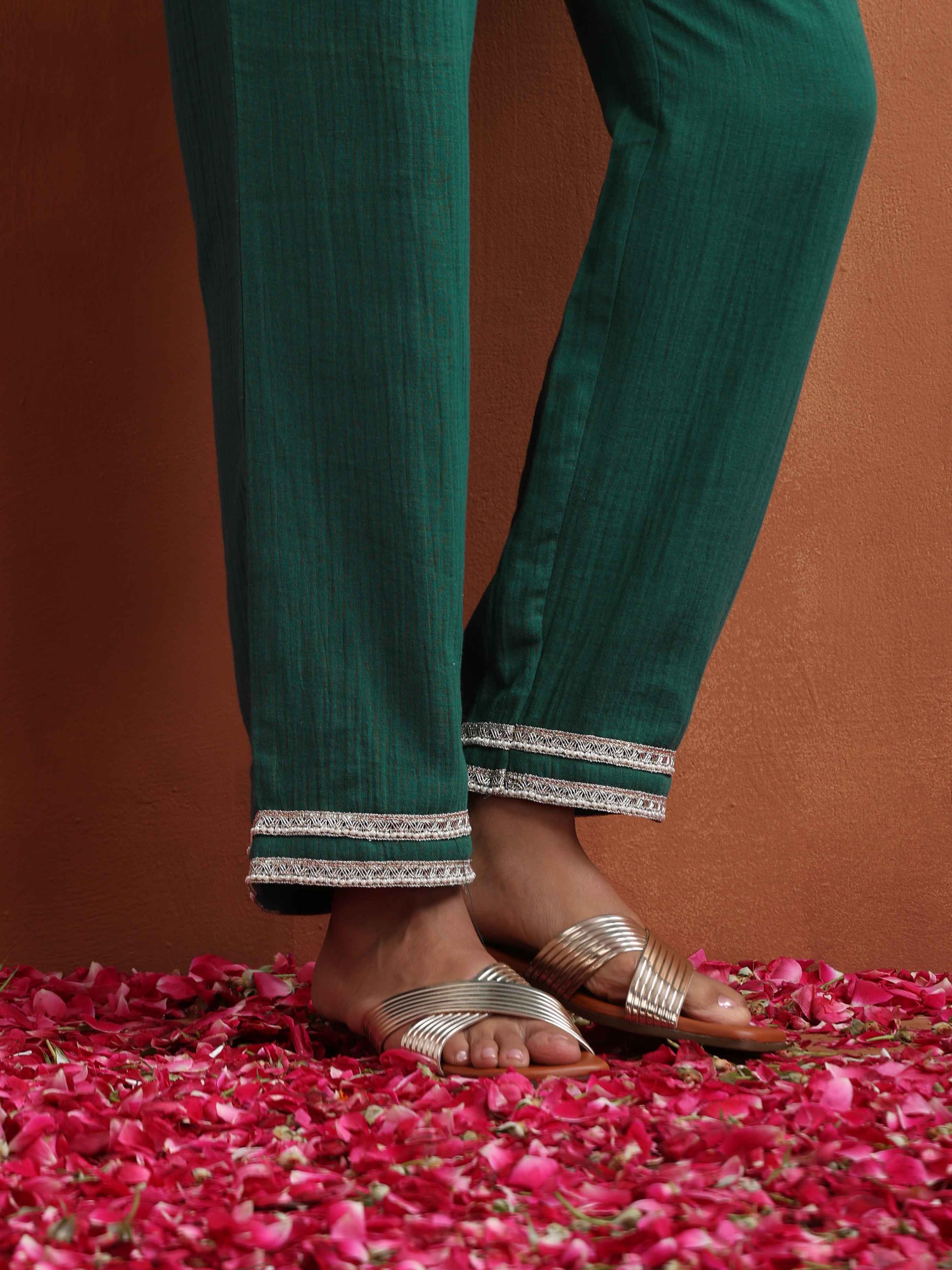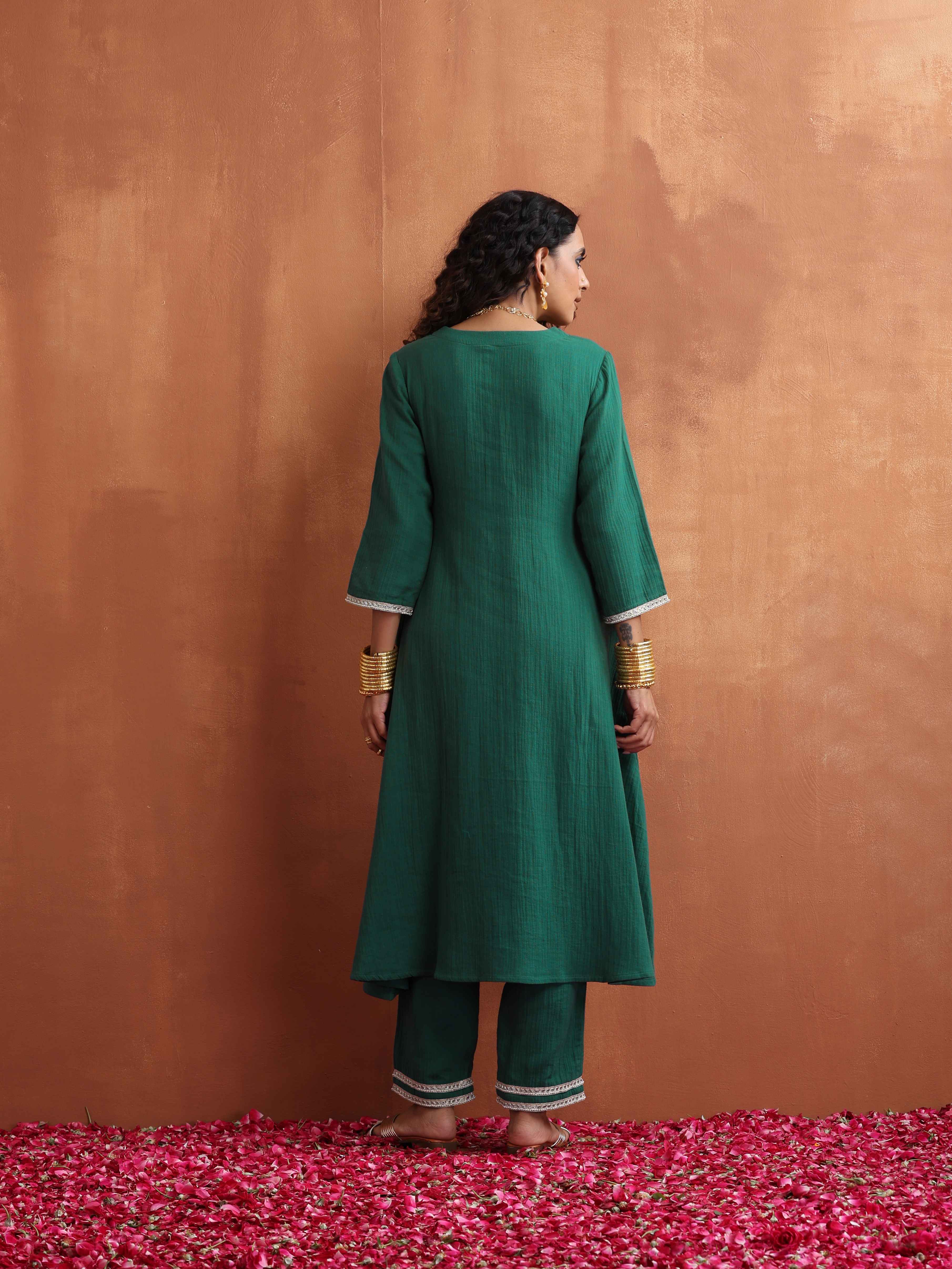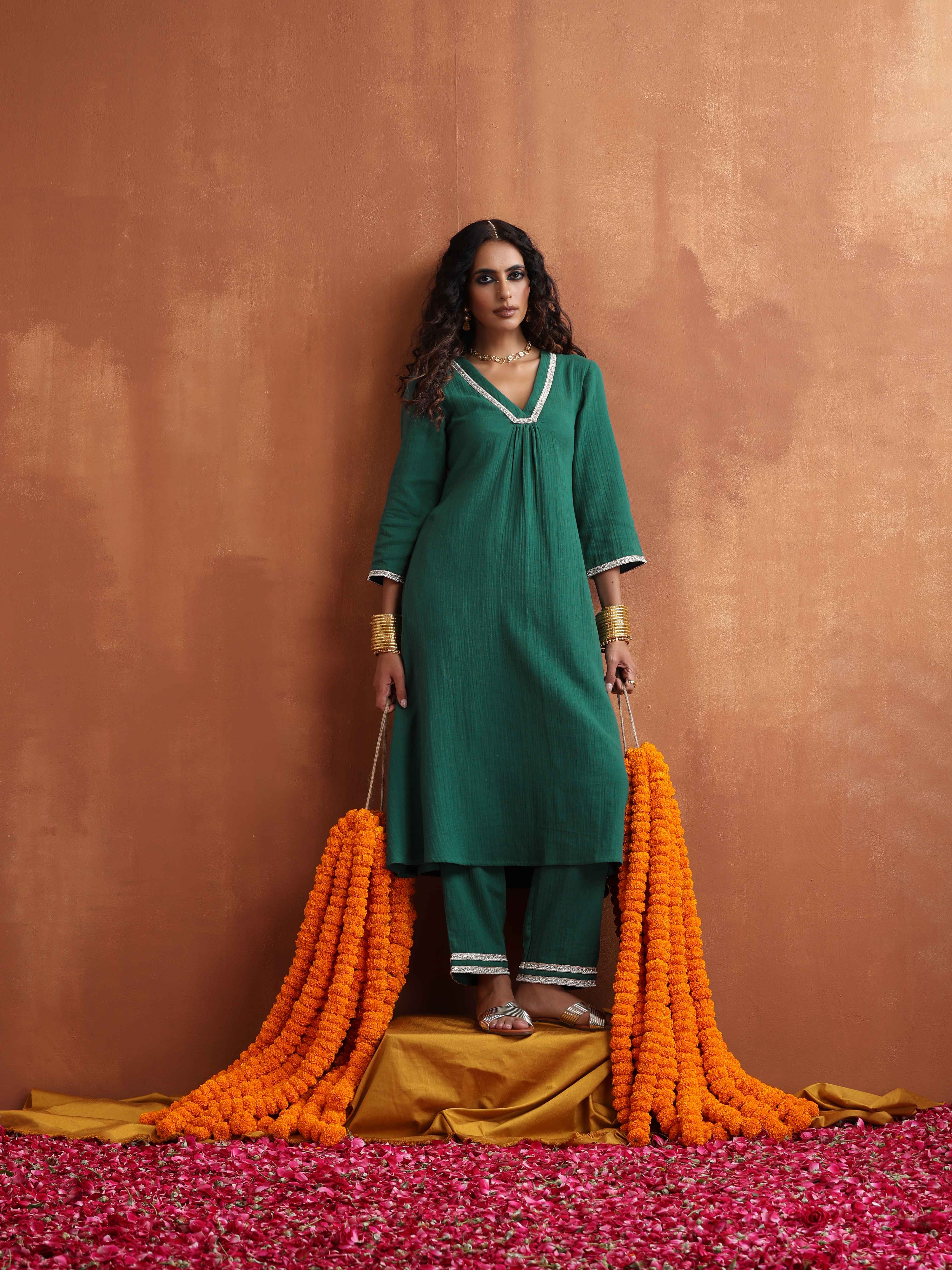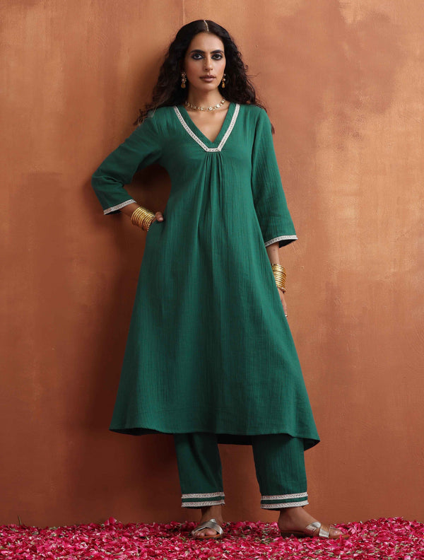 • Elevate your style with this green cotton A-line kurta paired with green cotton pant.
