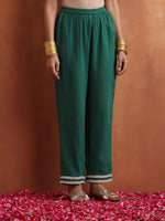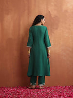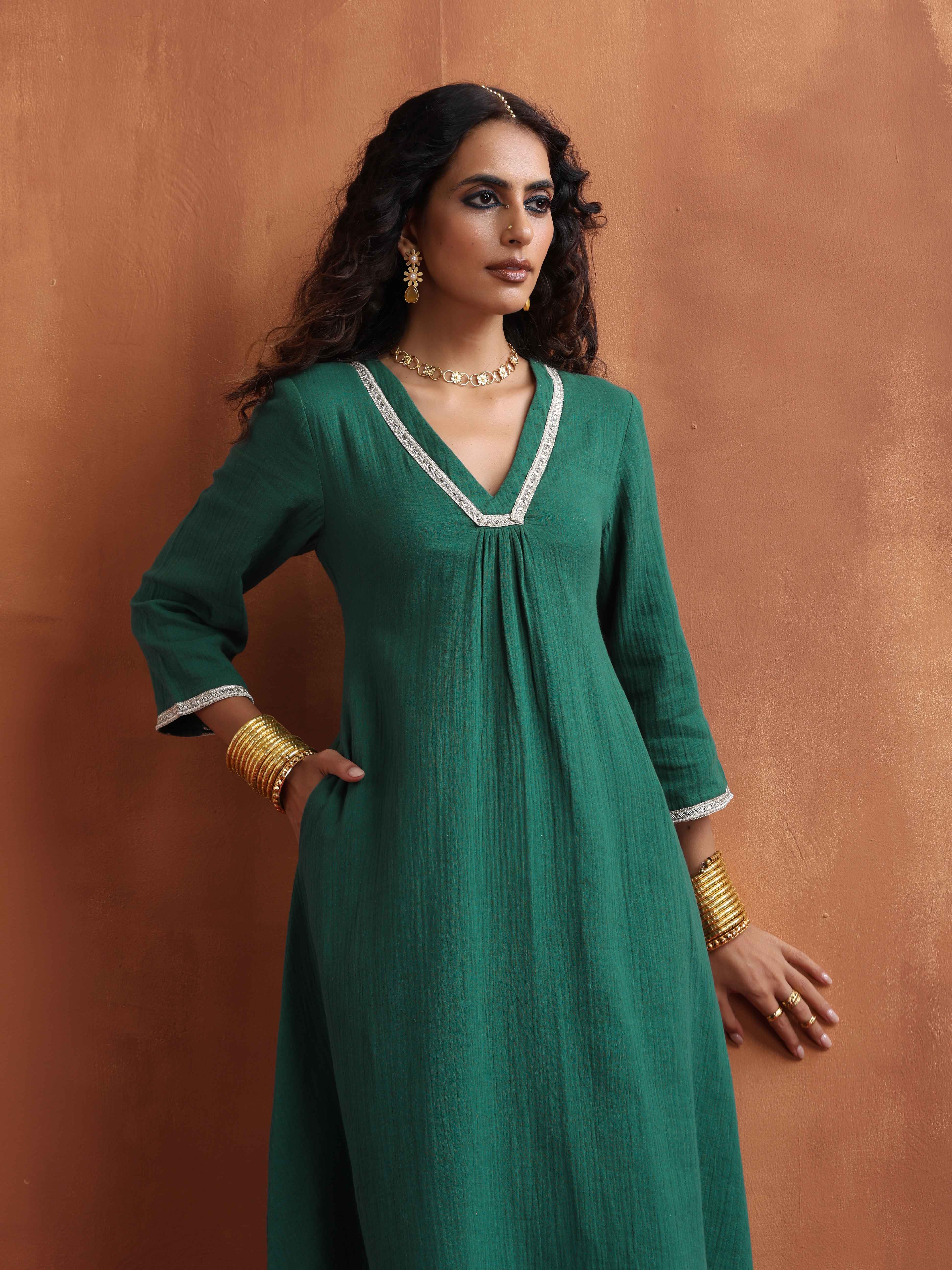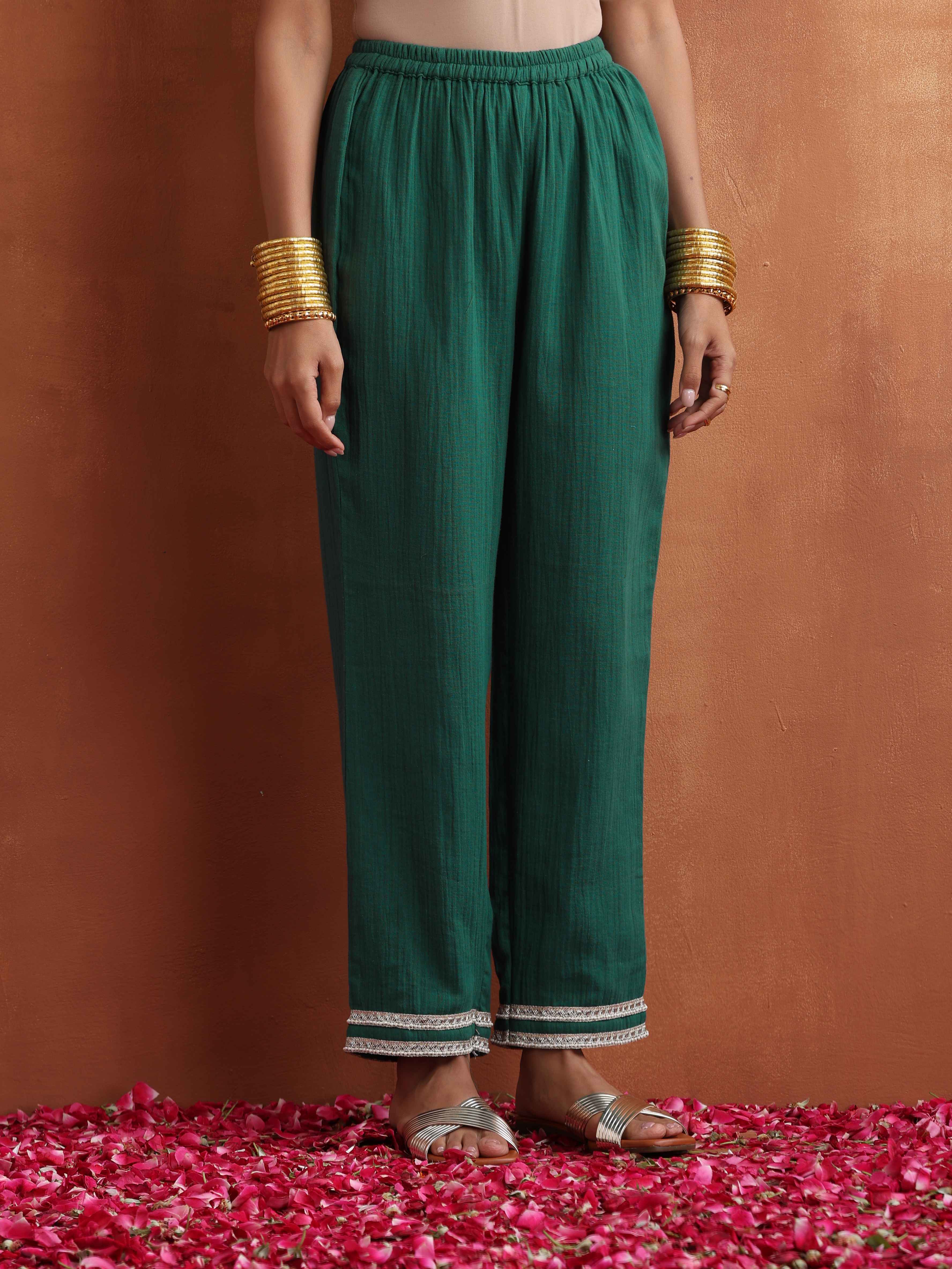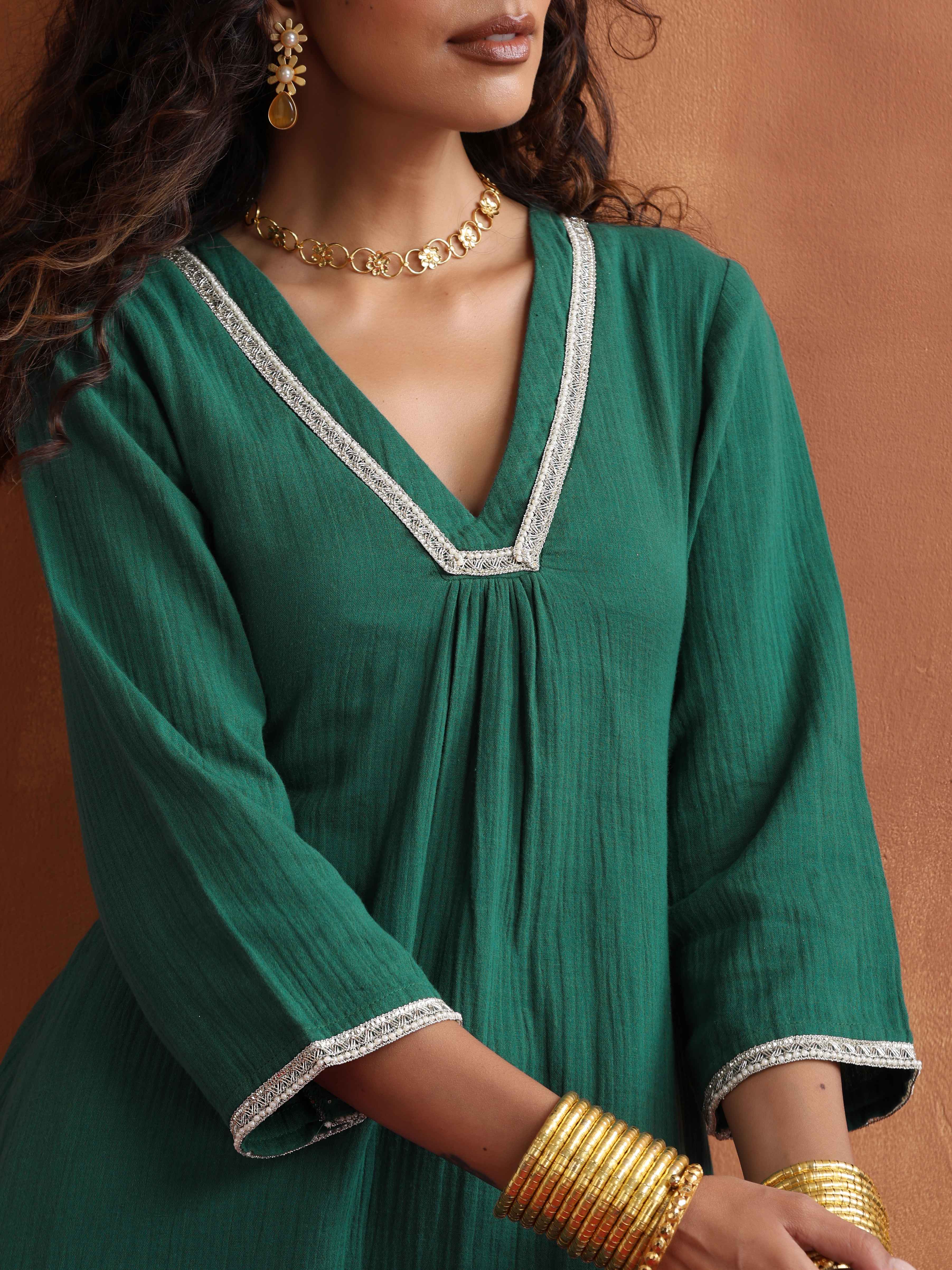 • Elevate your style with this green cotton A-line kurta paired with green cotton pant.