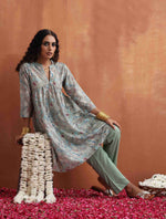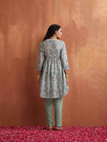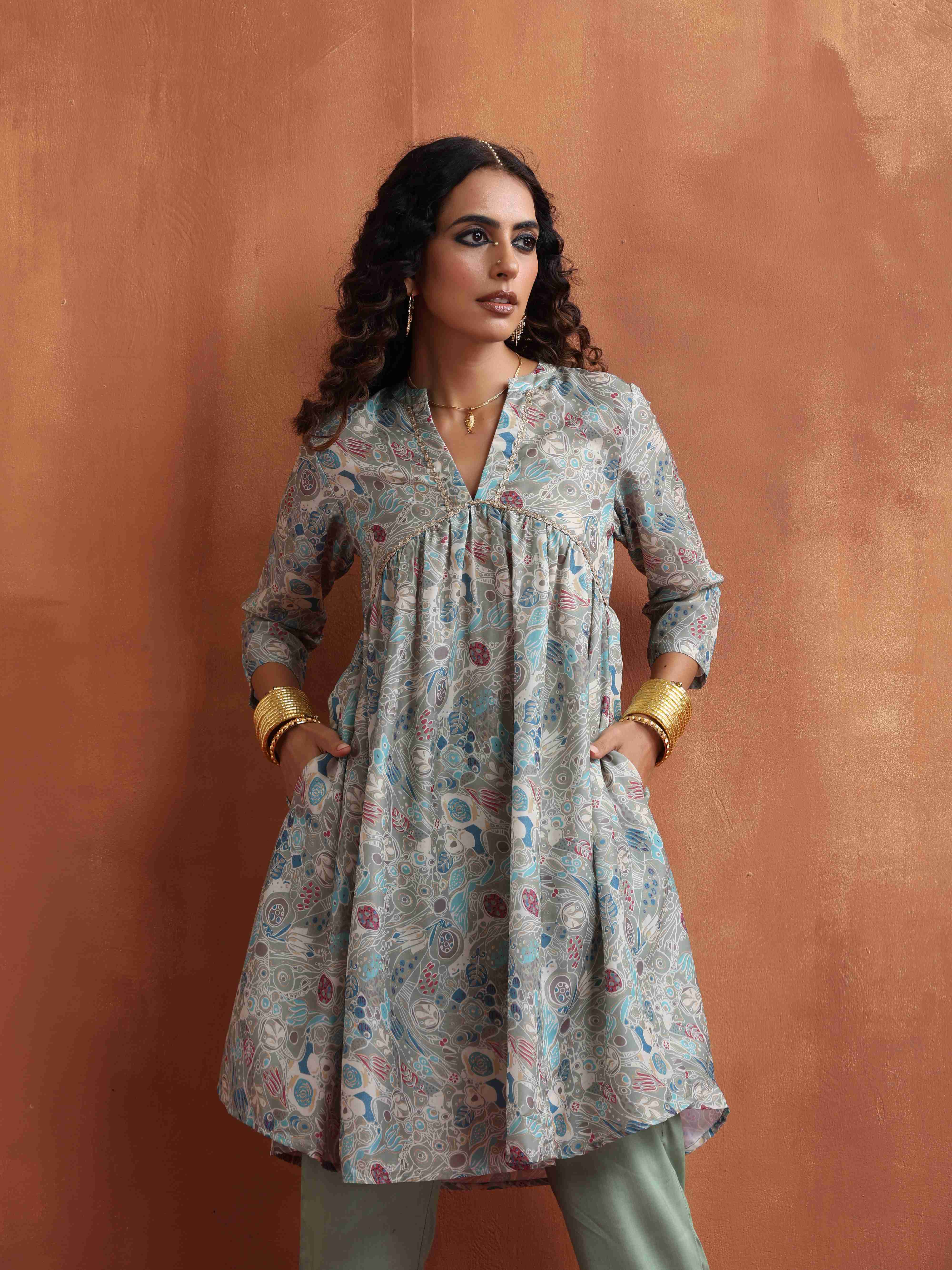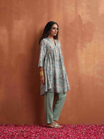 • Elevate your style with this green floral print short flared kurta paired with green pant
