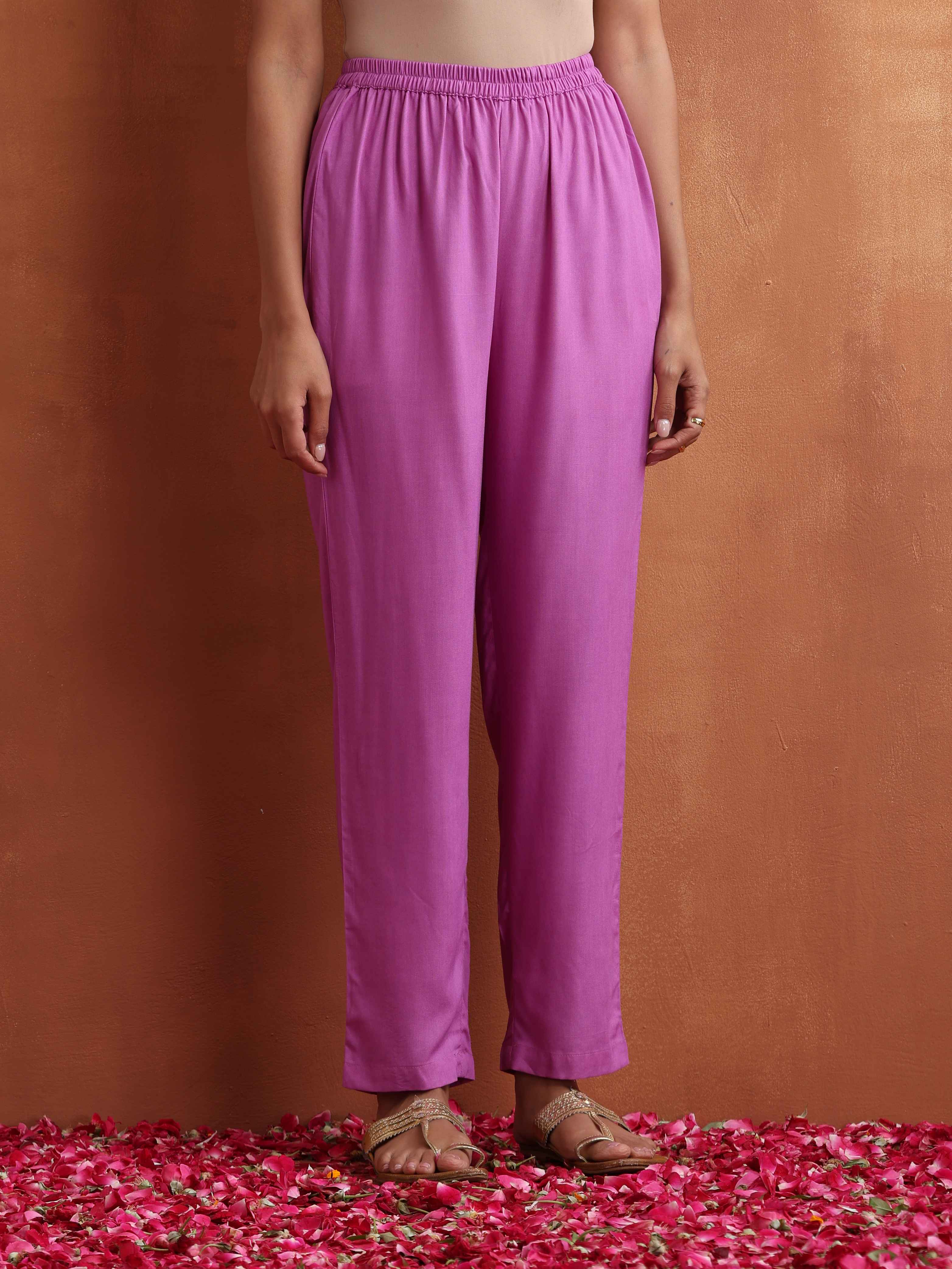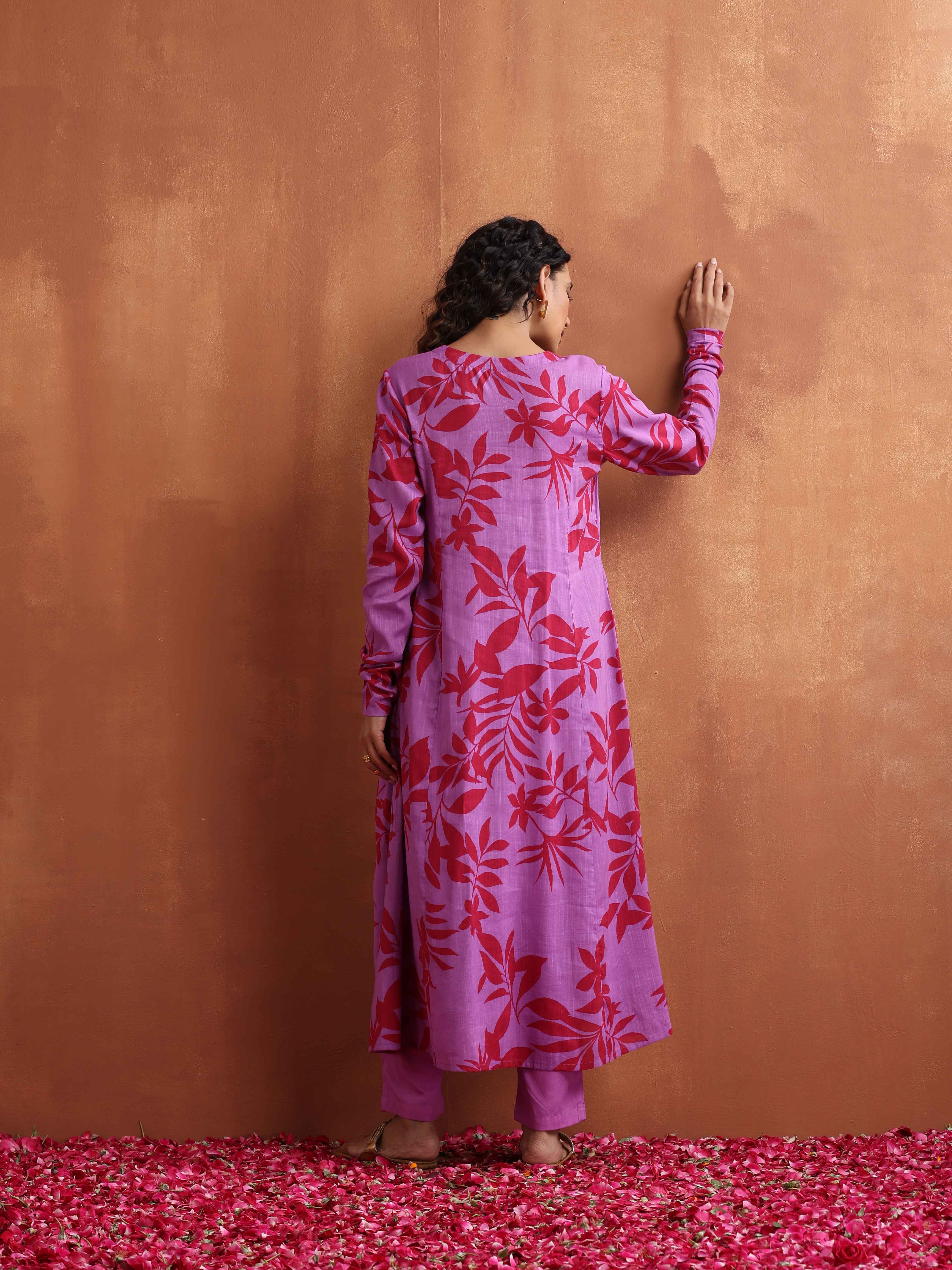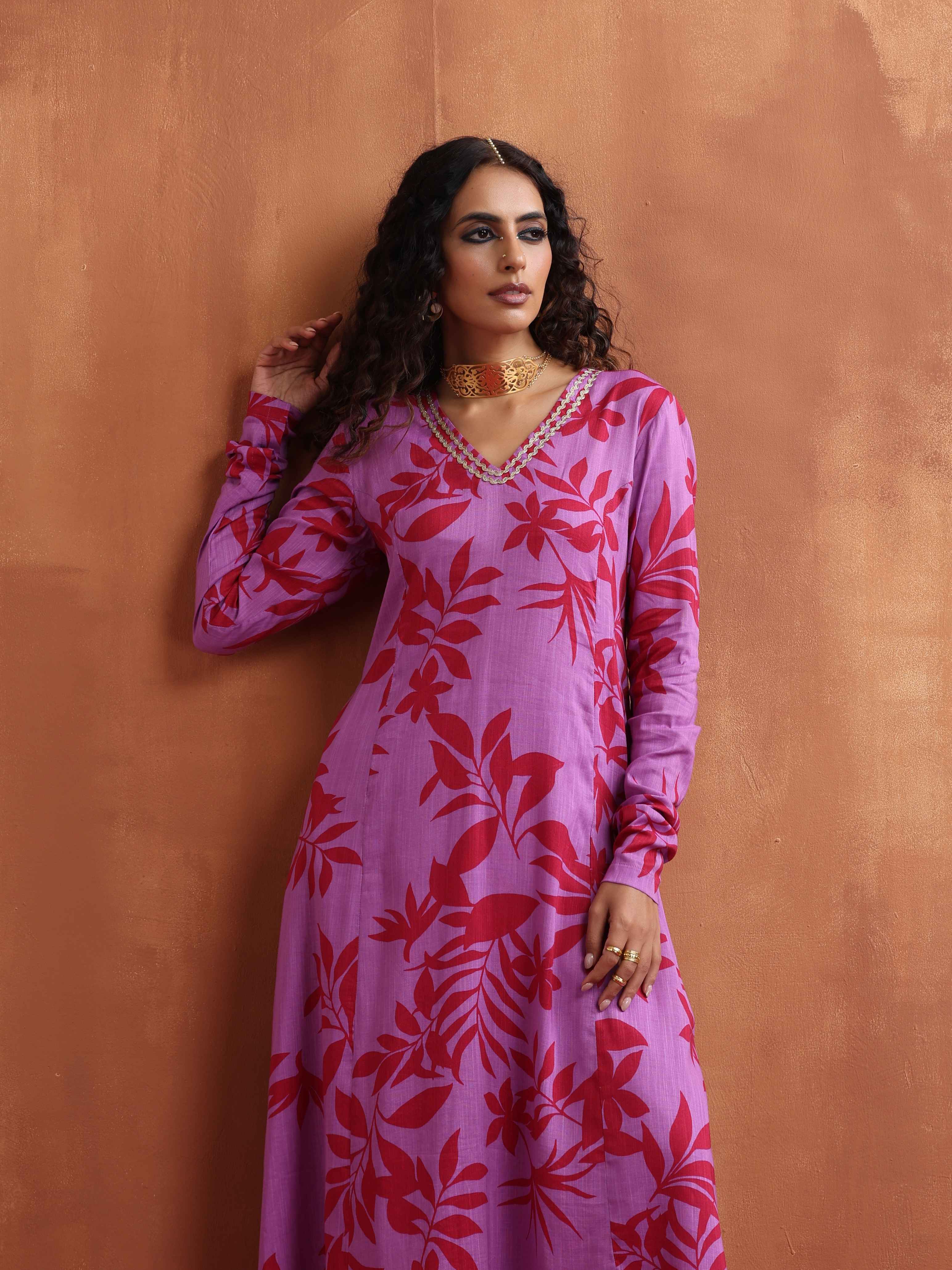 • Model height is 5.6ft and is wearing XS size. Elevate your style with this purple floral print A-line kurta paired with purple pant