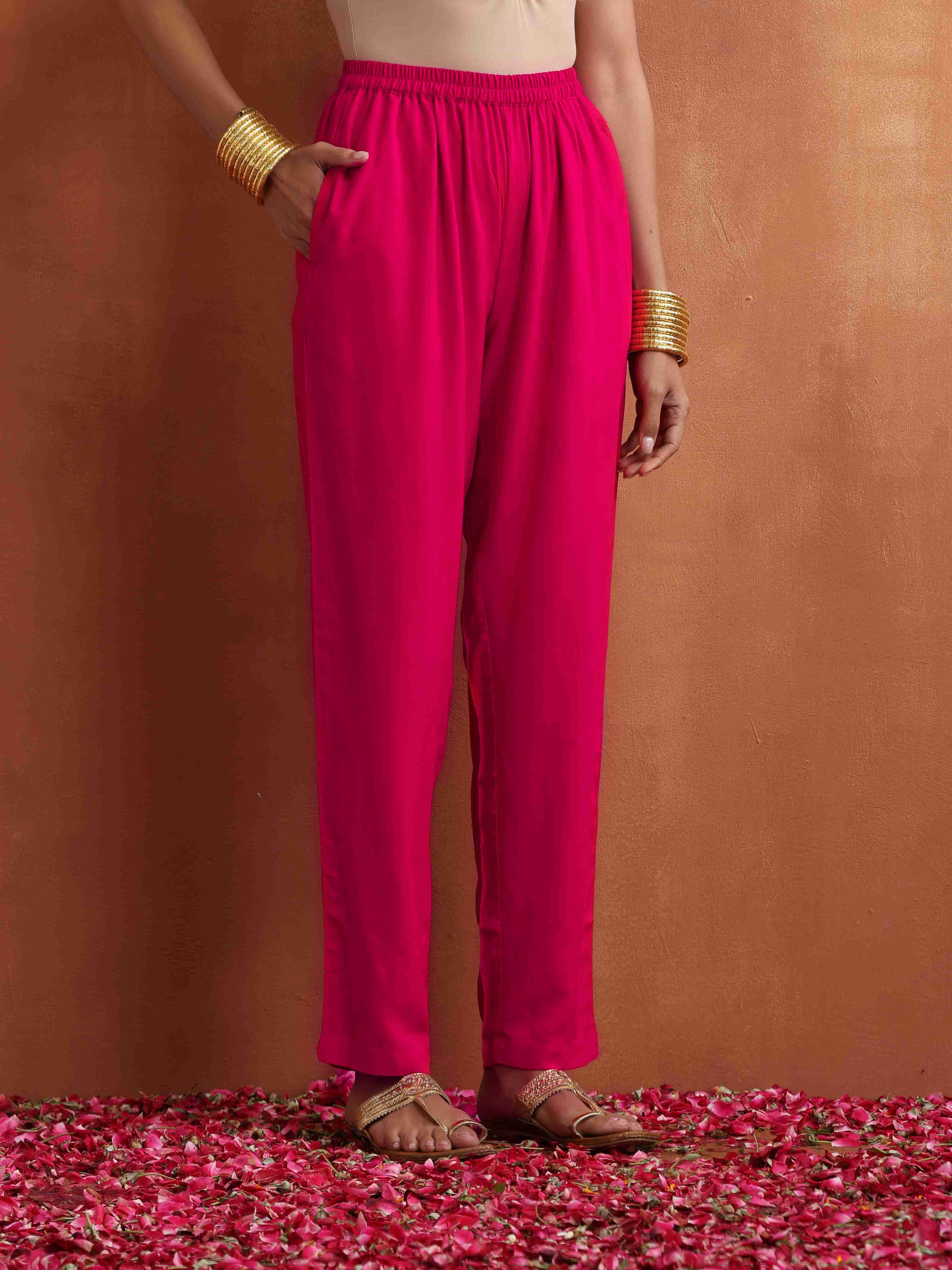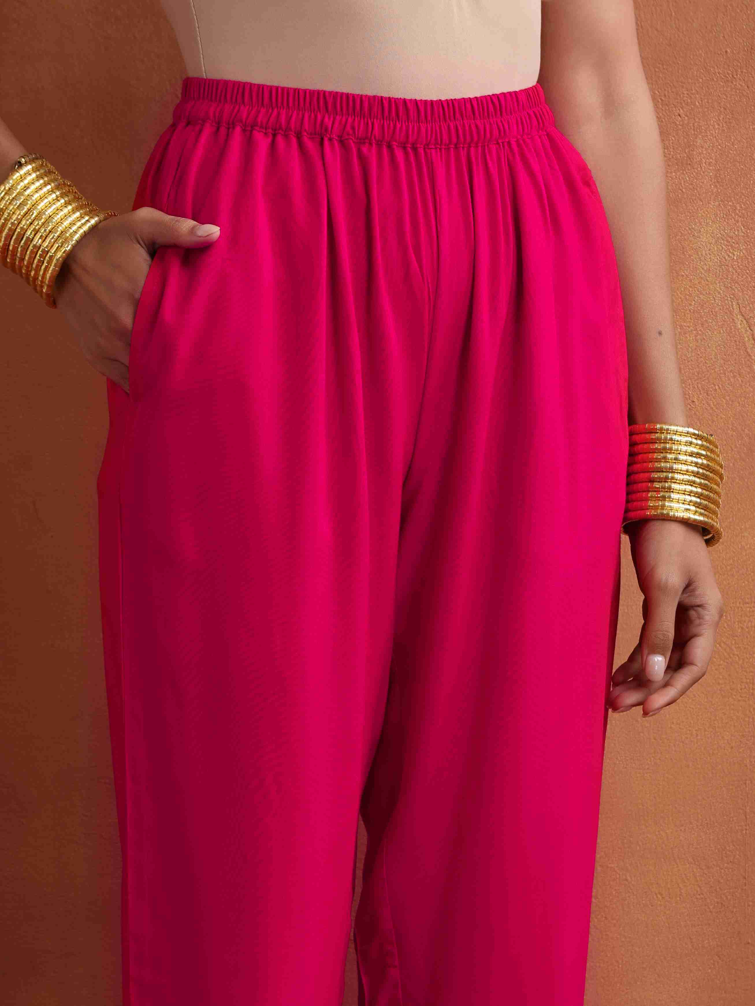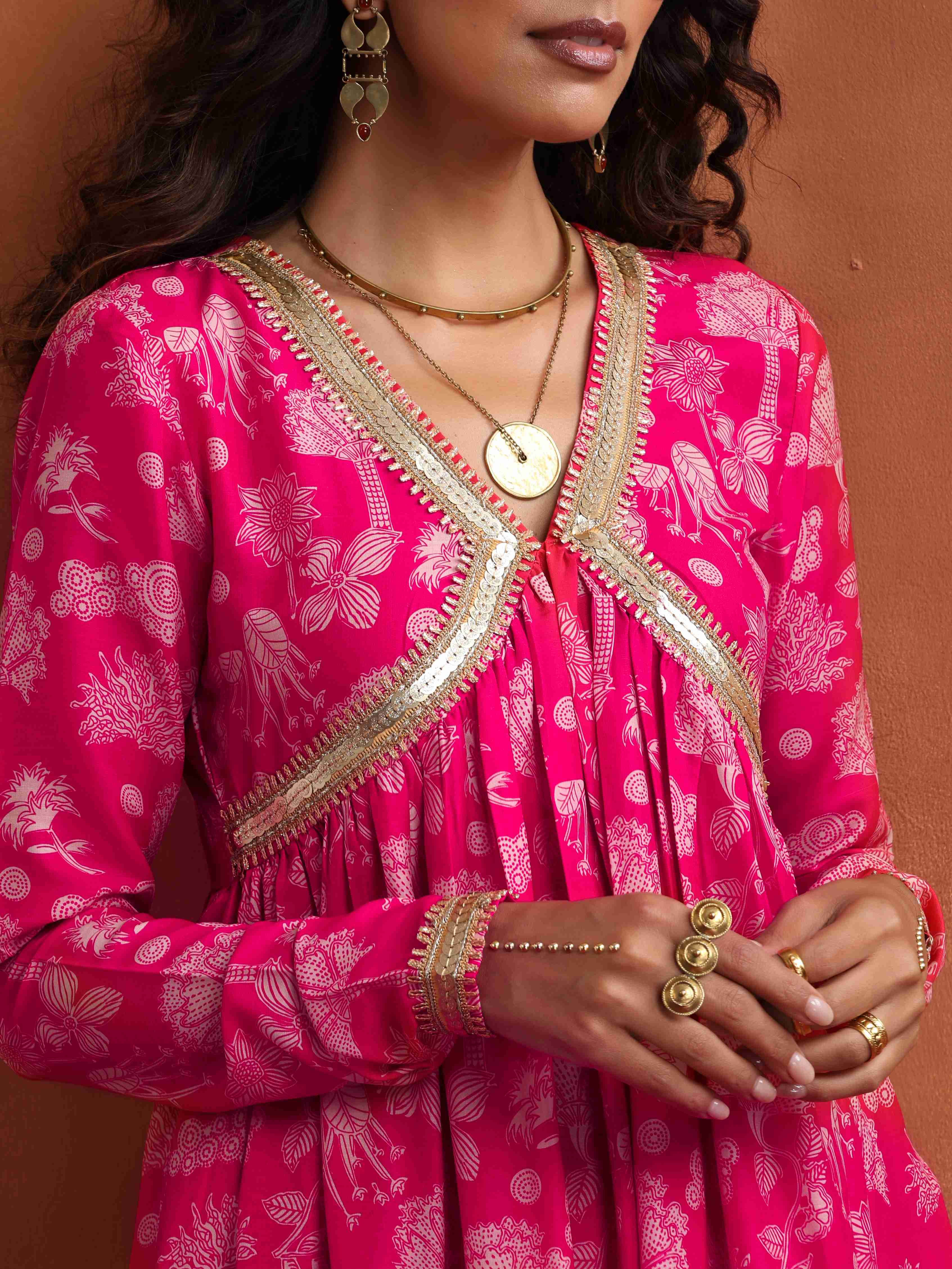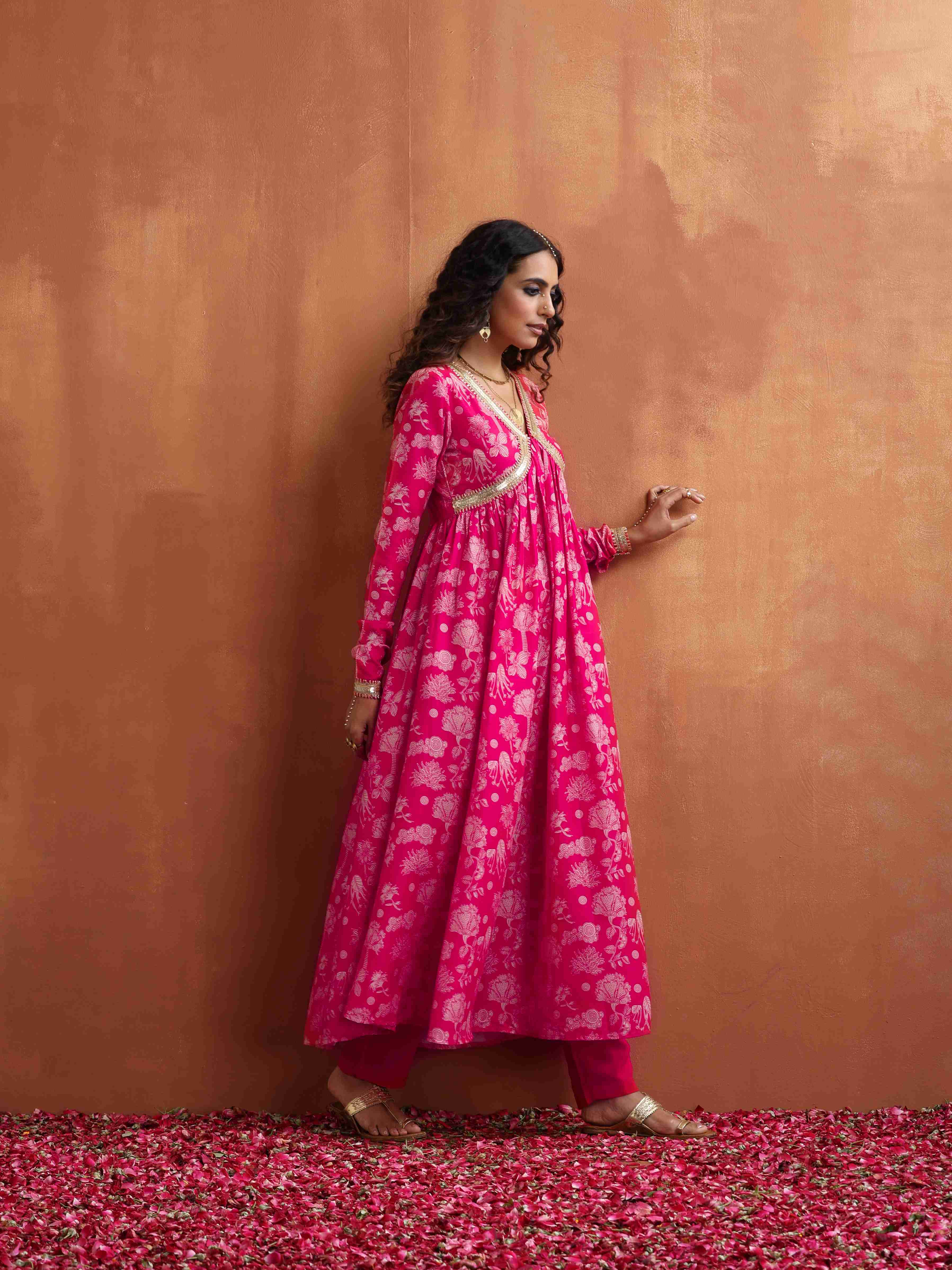• Elevate your style with this red floral print flared anarkali kurta paired with red pant.