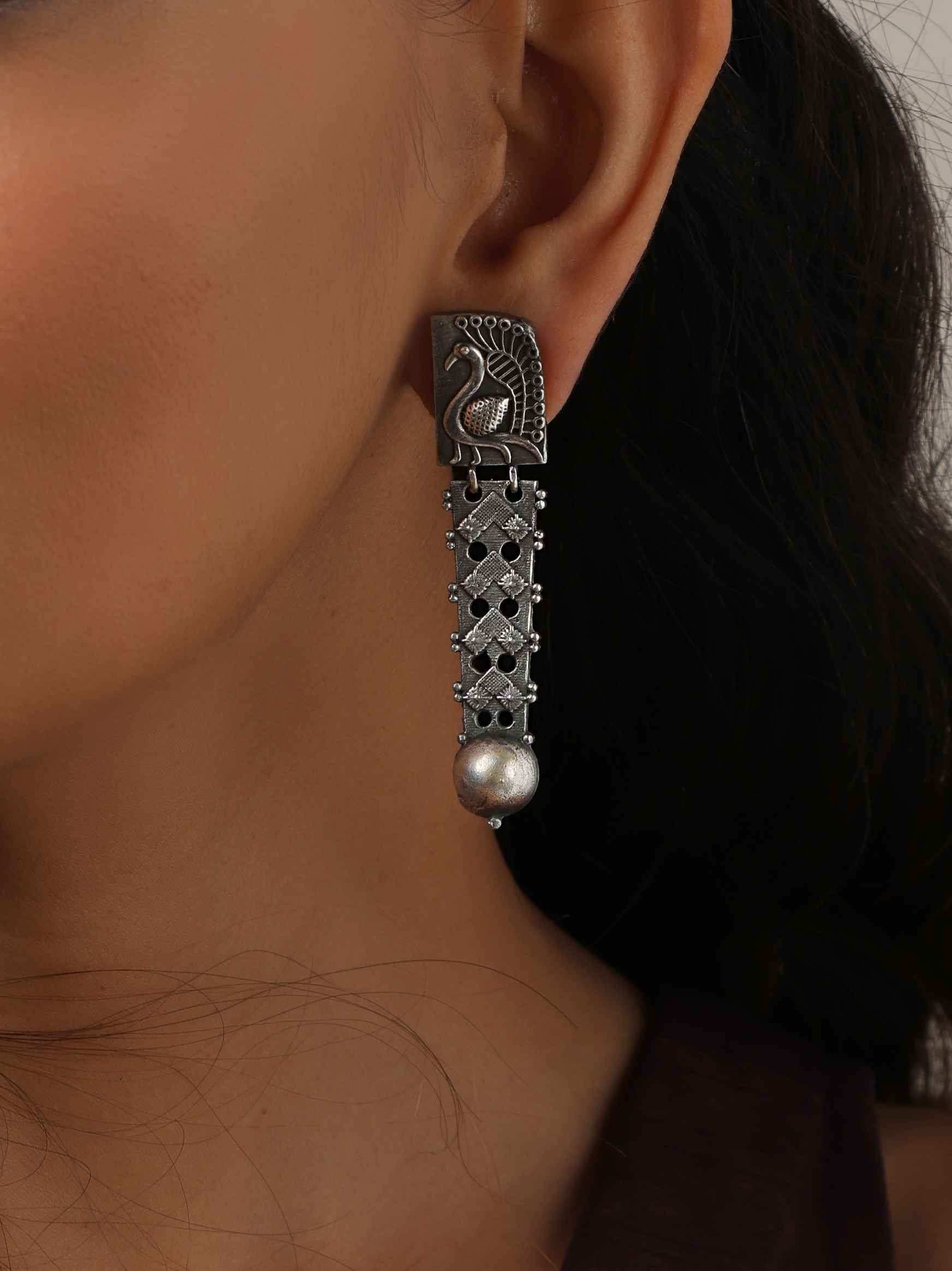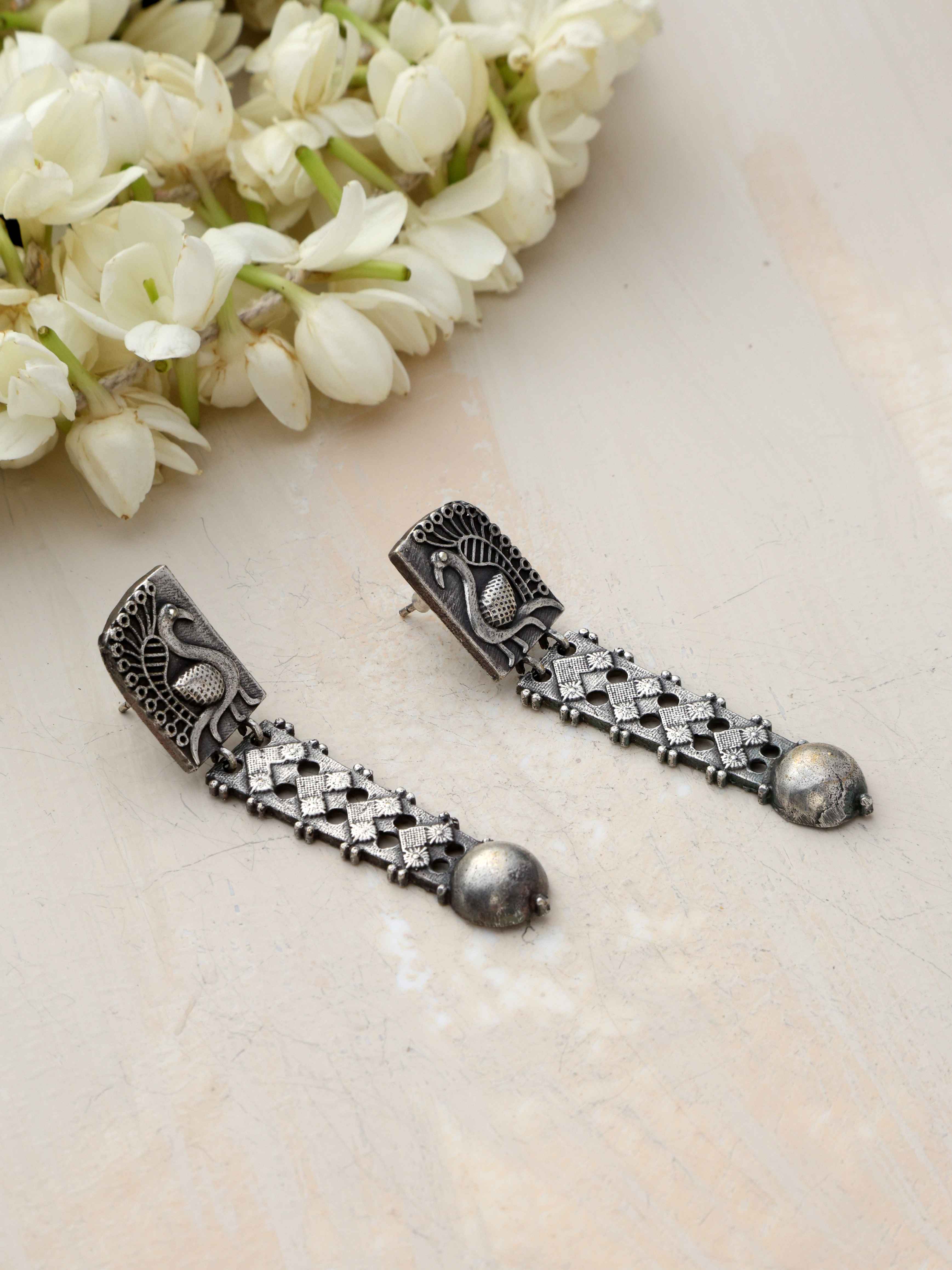 trueBrowns Silver Tone Flamingo Dangle EarringsDescription Silver flamingo dangle earring with post and back closure. Style it with a Kurta, Co-ord...
